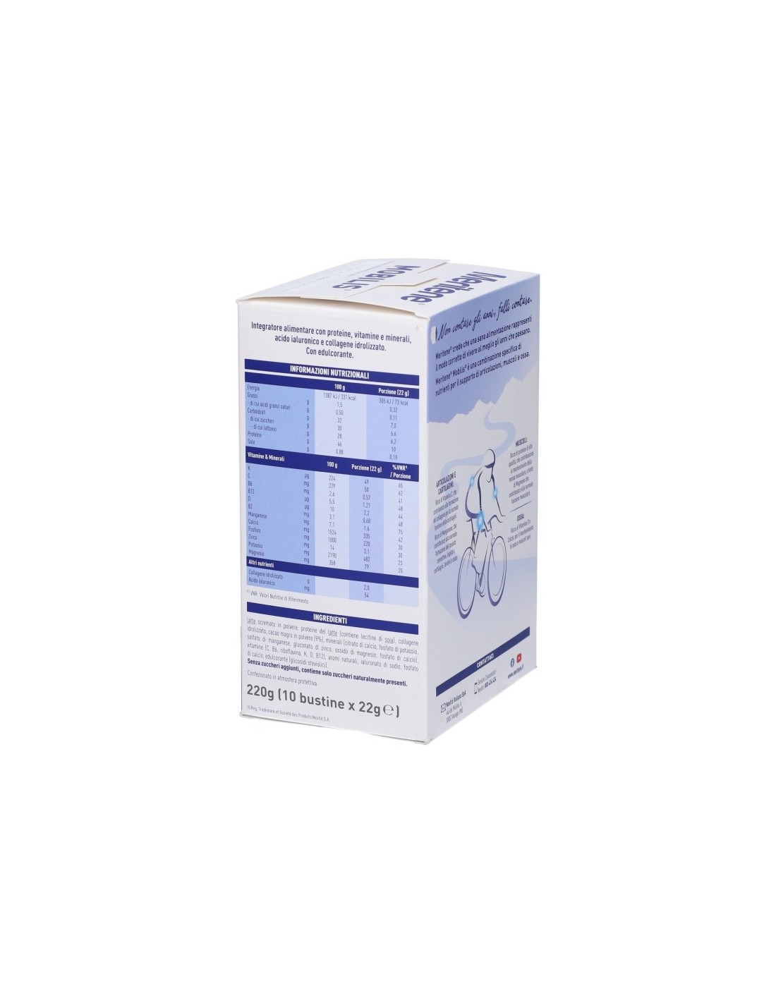Latte scremato in polvere, proteine del latte (contiene lecitine di soia), collagene idrolizzato, cacao magro in polvere (9%), minerali (citrato di calcio, fosfato di potassio, solfato di manganese, gluconato di zinco, ossido di magnesio, fosfato di calcio), vitamine (C, B6, riboflavina, K, D, B12), aromi naturali, ialuronato di sodio, fosfato di calcio, edulcorante (glicosidi steviolici).