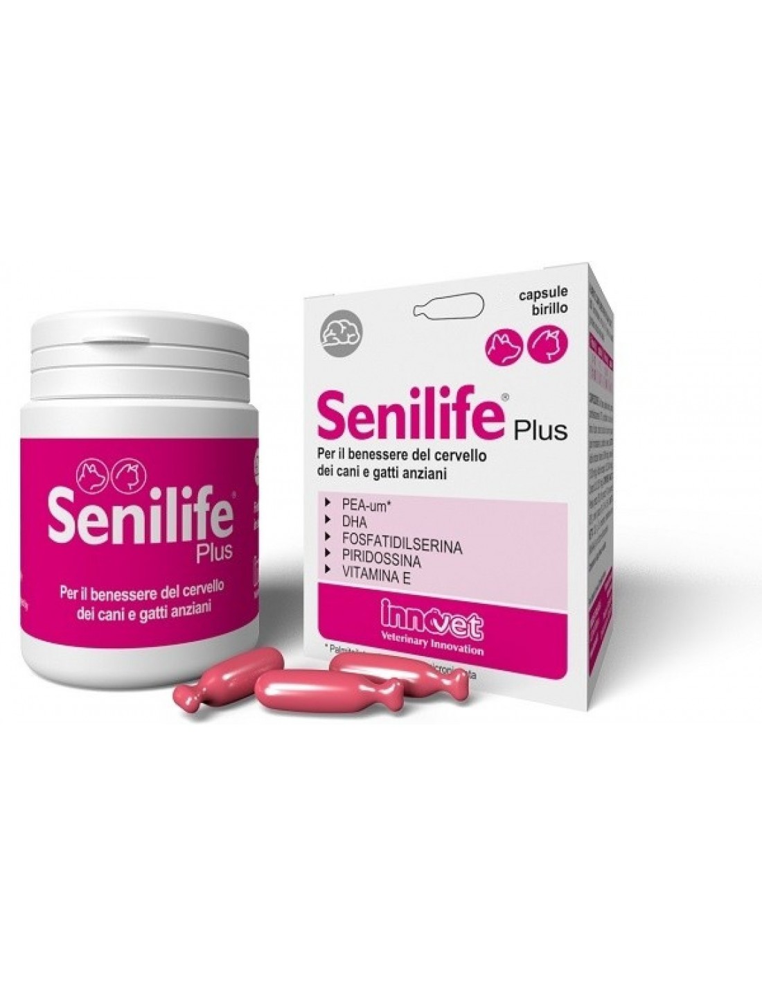 Prodotto utile per migliorare le funzioni cognitive e la memoria di cani e gatti anziani, per un invecchiamento cerebrale di successo. Contiene la PEA (palmitoiletanolamide), una sostanza naturale presente in molte fonti alimentari. Nell’organismo aiuta a mantenere l’equilibrio fisiologico di molti organi e tessuti, cervello compreso. Senilife Plus reintegra le riserve endogene di PEA nella sua forma a più alto assorbimento (ultra- micronizzata, PEA-um). La fosfatidilserina e il DHA sono importanti componenti naturali dei neuroni e ne mantengono la corretta fluidità di membrana. In sinergia con la piridossina, ottimizzano la neurotrasmissione. La vitamina E possiede una funzione antiossidante specifica, neutralizzando i radicali liberi prodotti durante l’invecchiamento cerebrale.