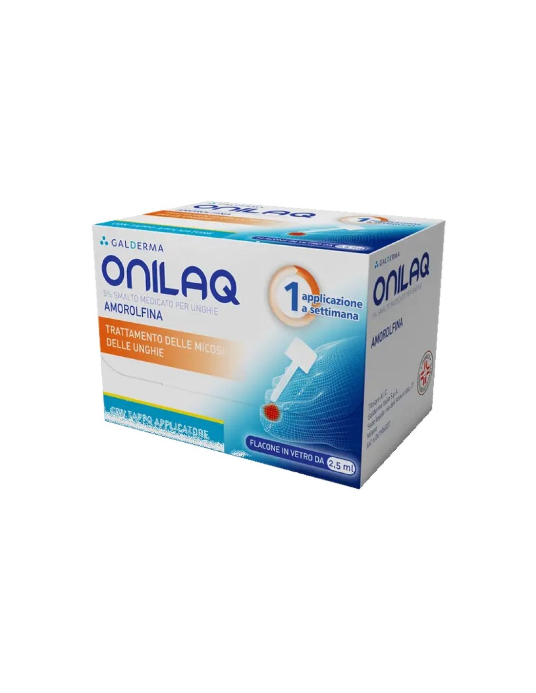 Posologia. Applicare ONILAQ sulle unghie affette una volta alla settim ana. Modo di somministrazione. Effettuare l'applicazione dello smalto osservando attentamente le seguenti raccomandazioni: A. Prima di inizi are il primo trattamento con ONILAQ, pulire accuratamente le unghie. E liminare eventuali strati di smalto precedentemente applicato con un s olvente per unghie; poi, con una limetta per unghie, limare la superfi cie dell'unghia (in particolare la superficie dell'unghia affetta) il piu' accuratamente possibile. Prestare attenzione a non limare l'area cutanea peri-ungueale. B. La superficie dell'unghia deve essere pulita e sgrassata utilizzando uno dei tamponi detergenti (in dotazione). C. Con uno degli applicatori in dotazione (riutilizzabili) applicare lo smalto su tutta la superficie dell'unghia. Tra un'applicazione sull'un ghia e l'altra pulire l'applicatore con il tampone detergente in dotaz ione, in modo da evitare di contaminare lo smalto medicato per unghie. Non strofinare l'applicatore sul bordo del flacone stesso. D. Per evitare di contaminare lo smalto, l'applicatore deve essere accuratamente pulito con uno dei tamponi detergente forniti, dopo ogni applicazione , prima di procedere con il trattamento di un'altra unghia. E. Se lo s malto viene a contatto con la parte esterna del tappo, pulire con un t ampone detergente in dotazione per evitare il contatto con la cute. F. Tenere il flacone ben chiuso. Ripetere il procedimento per ognuna del le unghie affette. Dopo ogni applicazione di ONILAQ, e' importante lav are le mani. Se l'applicazione avviene sulle unghie delle mani, attend ere che lo smalto sia completamento asciutto prima di procedere al lav aggio. Il trattamento deve essere continuato senza interruzioni fino a quando l'unghia si e' rigenerata e le aree colpite sono finalmente gu arite. In generale, la durata del trattamento e' di 6 mesi per le ungh ie delle mani e 9 mesi per le unghie dei piedi (la durata dipende esse nzialmente dall'intensita', dalla localizzazione, dalla velocita' di c rescita dell'unghia e dall'estensione dell'infezione). Dopo un trattam ento di 3 mesi senza risultati, consultare il medico. Istruzioni speci ali: - Le limette utilizzate per unghie malate non devono essere utili zzate per le unghie sane. - Prima di ogni nuova applicazione, rimuover e ogni residuo di smalto, limare le unghie colpite, se necessario, e p oi pulirle sempre con un tampone detergente.