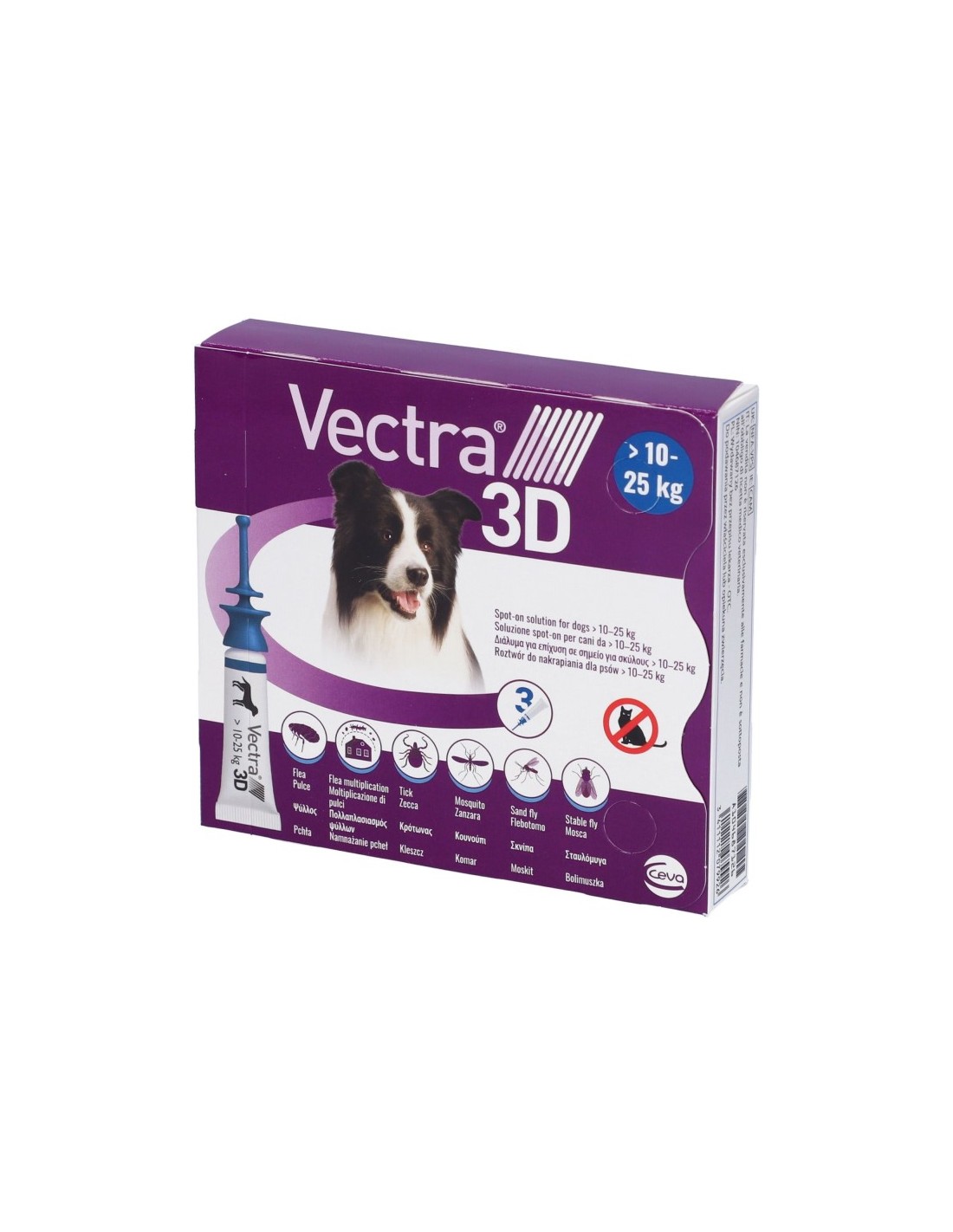 Vectra 3D è usato nei cani per il trattamento e la prevenzione di infestazioni da pulci e zecche. Inoltre, esercita un’azione repellente contro flebotomi, zanzare e mosche. ( Stomoxys calcitrans ). La sua azione dura fino a un mese e previene la moltiplicazione delle pu lci, inibendo l’ apertura delle uova e la comparsa degli adulti per due mesi. Può essere utilizzato anche nell’ambito di una strategia per il trattamento della dermatite allergica da pulci (una reazione allergica ai morsi di pulce).