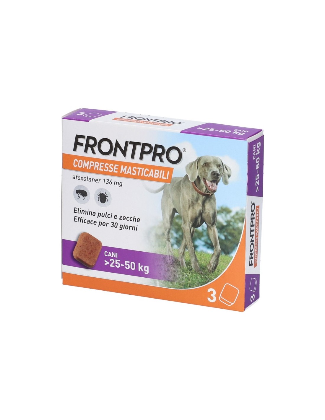 Frontpro Contro Pulci e Zecche 3 Compresse Masticabili Per Cani 25-50 Kg 136mg