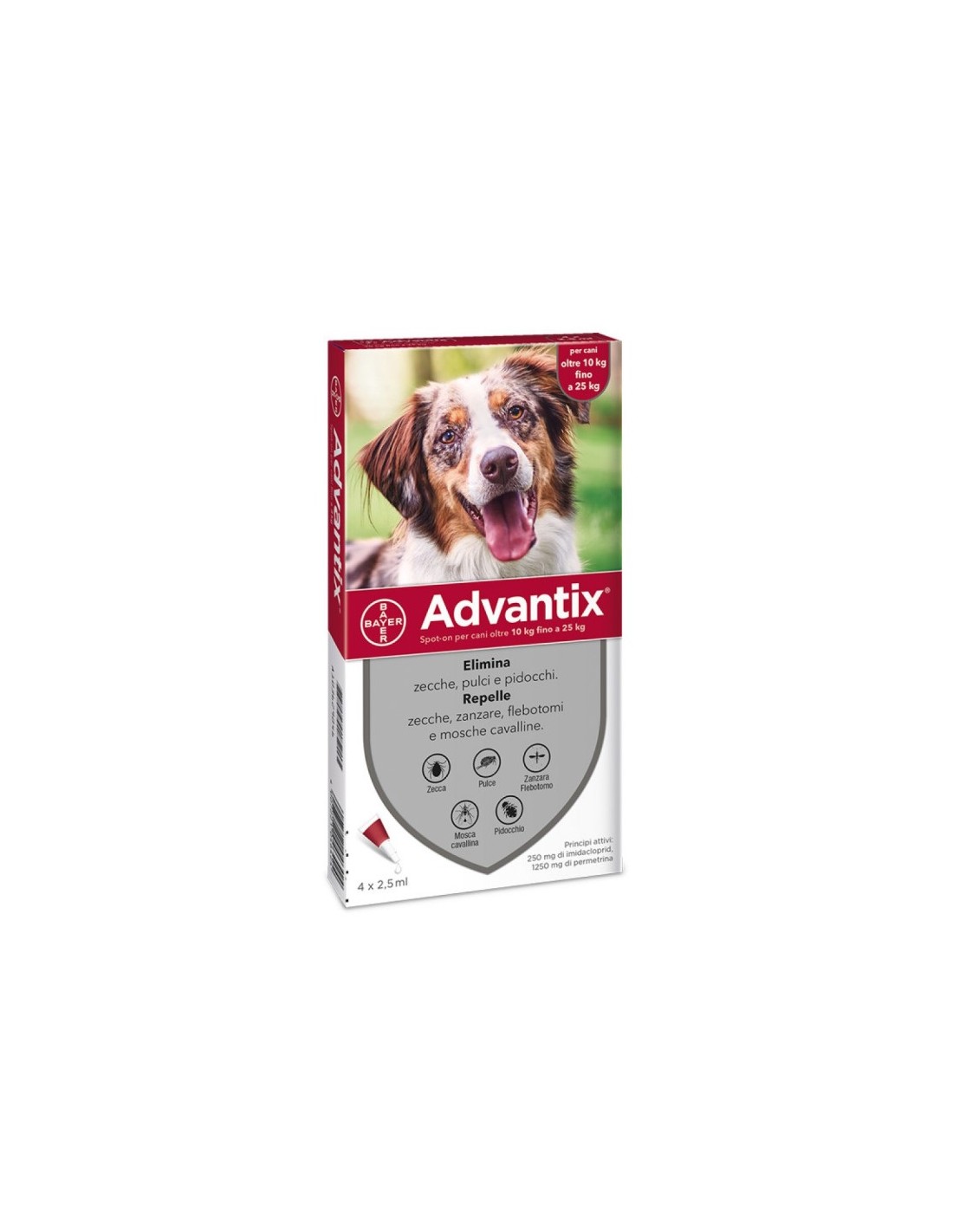 Cani (kg peso corporeo): >25 kg <= 40 kg; nome commerciale: advantix spot-on per cani oltre 25 kg fino a 40 kg; volume: 4,0 ml; imidacloprid: 10 - 16 mg/kg peso corporeo; permetrina: 50 - 80 mg/kg peso corporeo.