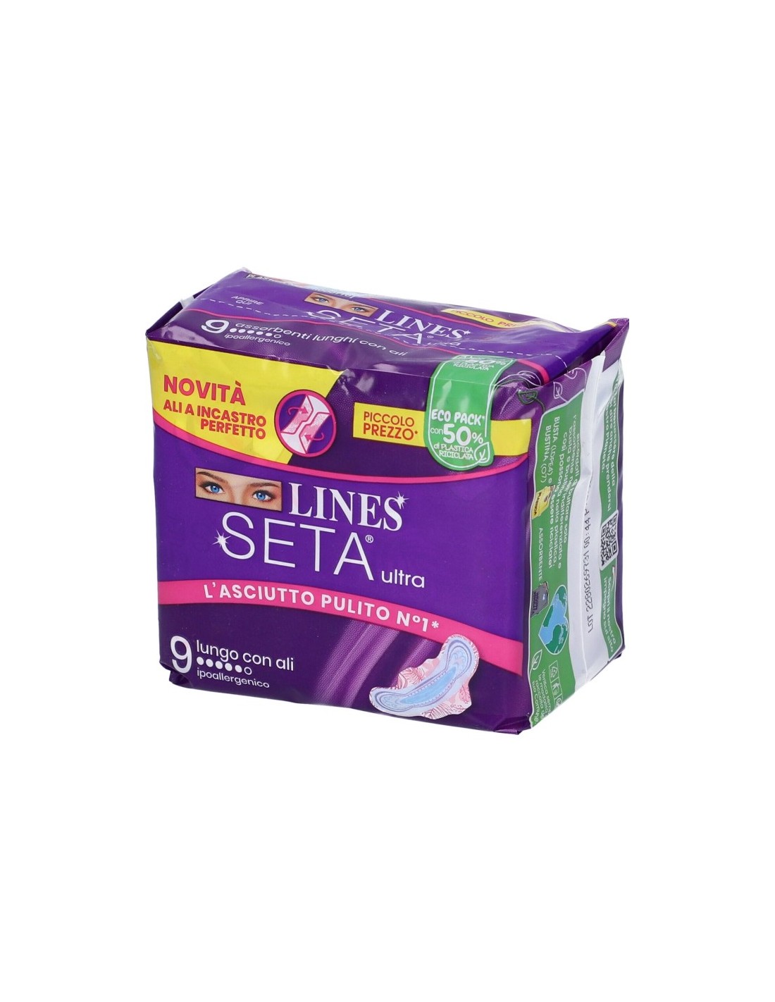 Nuovo Lines Seta Ultra, l'asciutto pulito N. 1 in Italia da oggi con le esclusive ali ad incastro perfetto che combaciano senza sovrapporsi mai, così puoi rimuovere l'assorbente con un gesto.