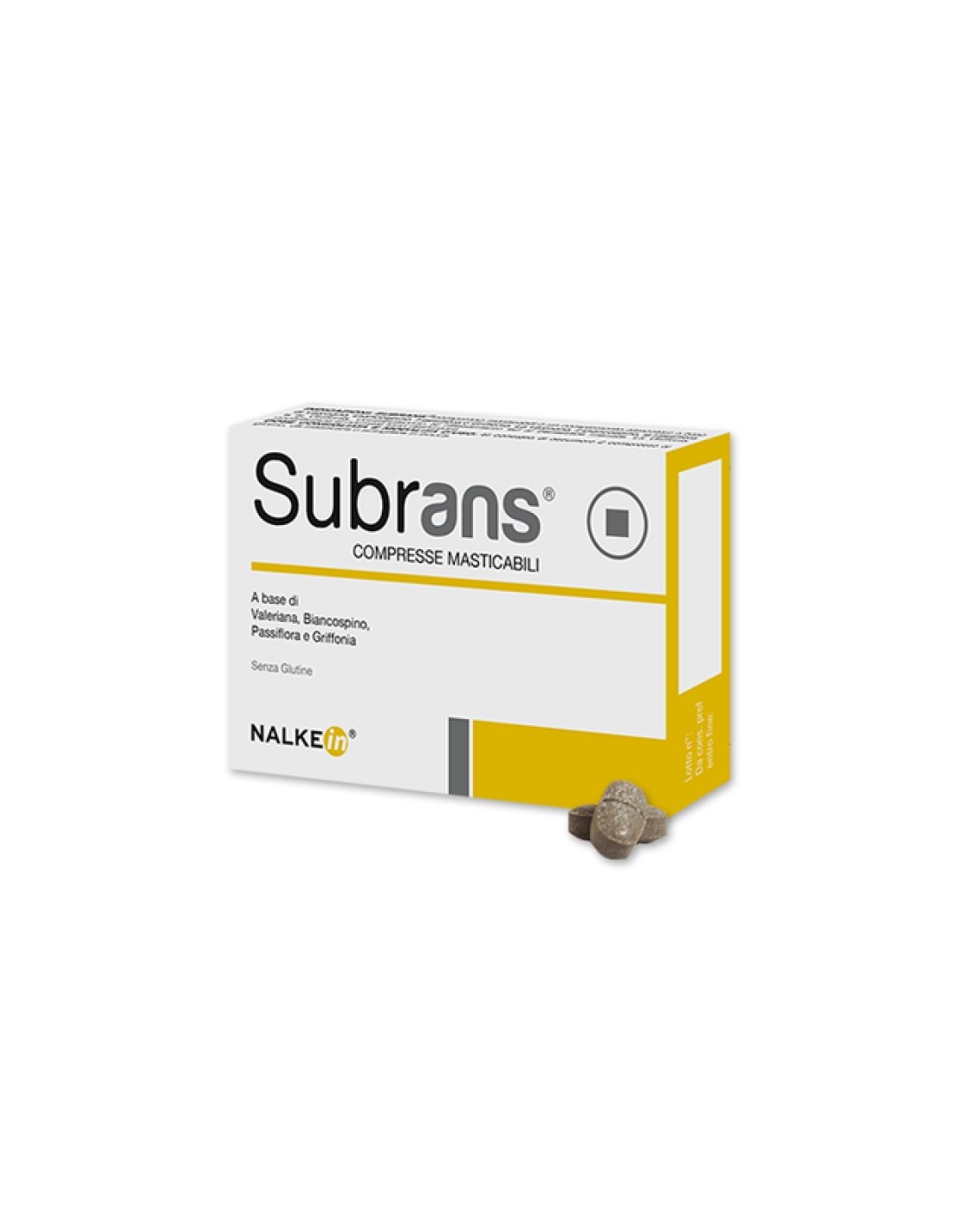 SUBRANS® compresse masticabili è un complemento alimentare a base di Valeriana, Biancospino, Passiflora e Griffonia. La Valeriana, il Biancospino, la Passiflora e la Griffonia, contribuiscono al rilassamento ed al benessere mentale. La Griffonia contribuisce al normale tono dell’umore.