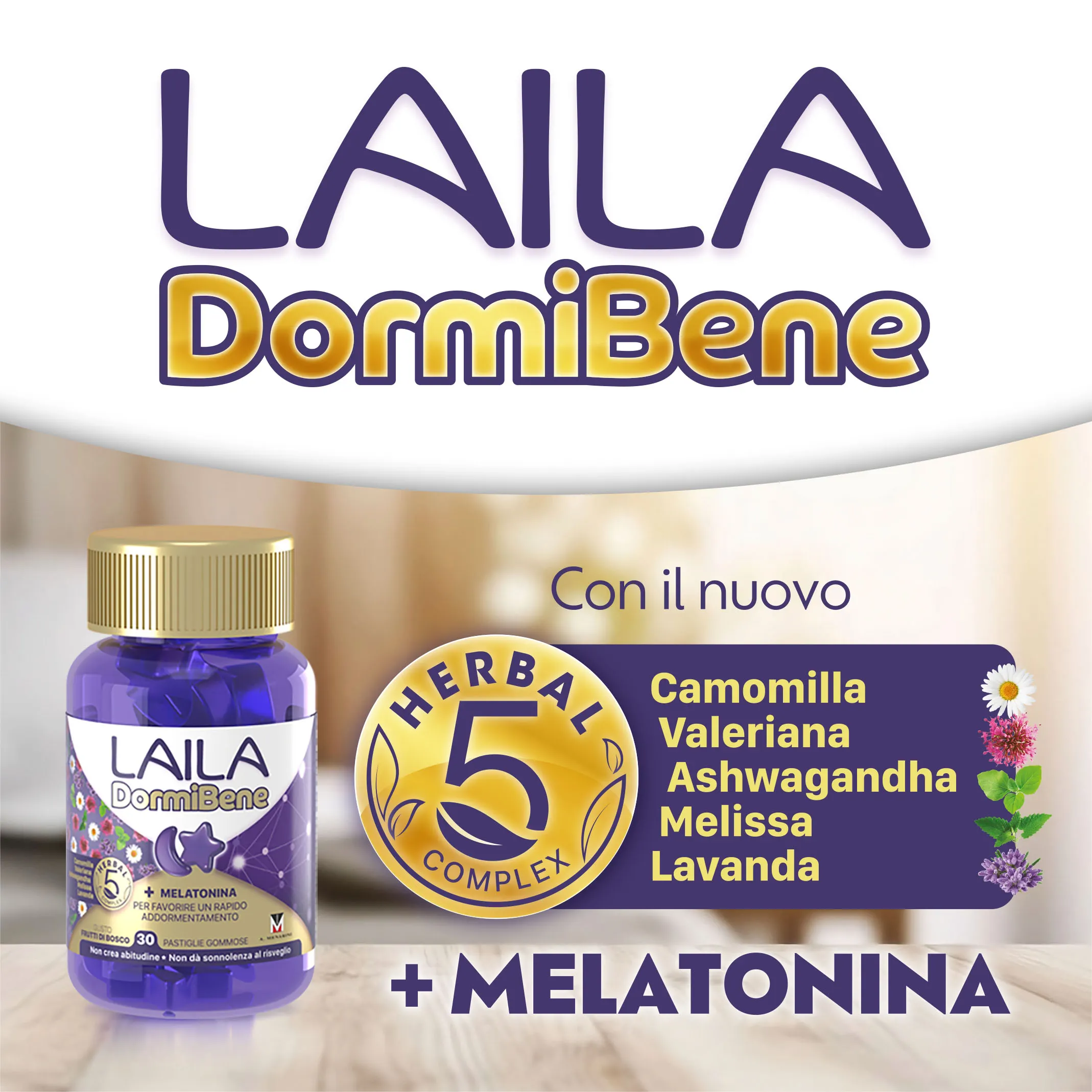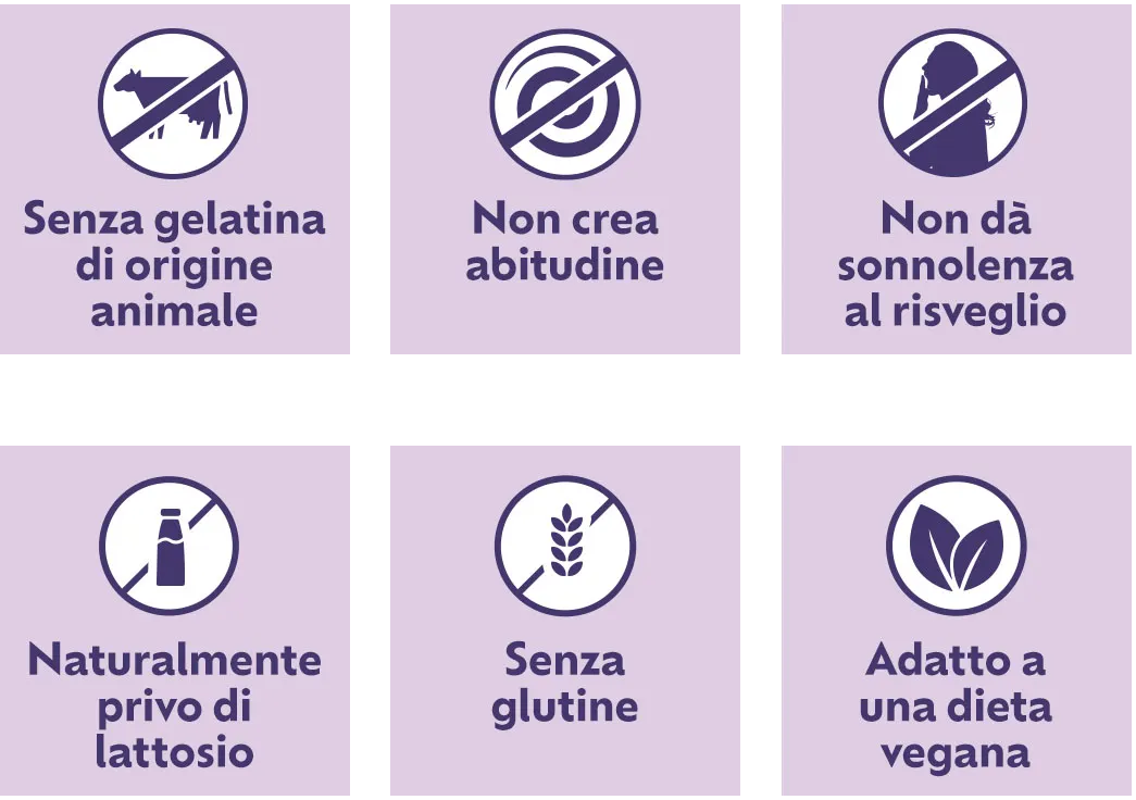 Maltitolo, Sorbitolo, Acqua, gelificante: Pectina; acidificante: E 330; Ashwagandha (Withania somnifera (L.) Dunal) radice estratto secco tit. 1,5% Withanolidi, Camomilla (Matricaria chamomilla L.) fiori estratto secco, Melissa (Melissa officinalis L.) foglie estratto secco tit. 2,5% Acido Rosmarinico, Lavanda (Lavandula angustifolia Mill.) fiori estratto secco, colorante: E 163; correttore di acidità: E 331; Valeriana (Valeriana officinalis L.) radice estratto secco tit. 0,15 Acido Valerenico, Aroma naturale, Melatonina, agente antiagglomerante: E 903