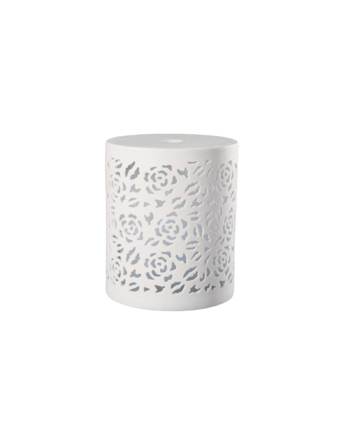 Diffusore elettrico con tecnologia ad ultrasuoni, per nebulizzare gli oli essenziali e sfruttarne le virtù aromaterapiche. Silenzioso e sicuro, genera vibrazioni ultrasoniche che permettono all'acqua di combinarsi rapidamente con gli oli essenziali, senza surriscaldarli o alterarne le proprietà: i benefici vapori prodotto, oltre a profumare e purificare l'aria, aiutano anche a microumidificarla. Nel contempo, grazie alla luce intercambiabile, possono alternare diverse sequenze cromatiche potenziando gli effetti delle essenze con le qualità riequilibranti, stimolanti e rilassanti dei colori. Questo modello "origami" è realizzato in ceramica con decorazioni traforate raffiguranti delle rose.