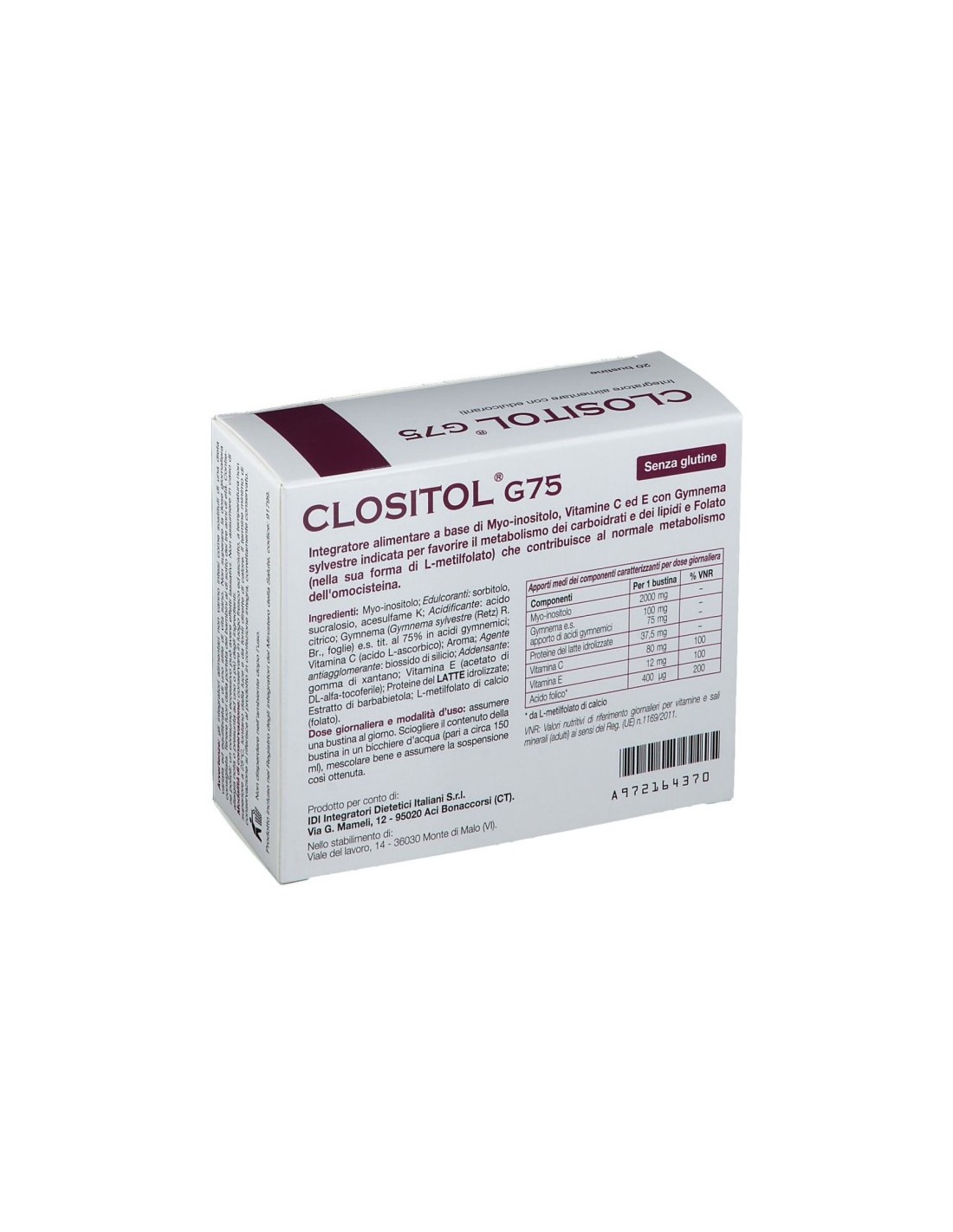 Clositol G75 è un integratore alimentare a base di Myo inositolo, Gymnema sylvestre, vitamine C ed E e con L-metilfolato (forma biologicamente attiva della provitamina acido folico).
