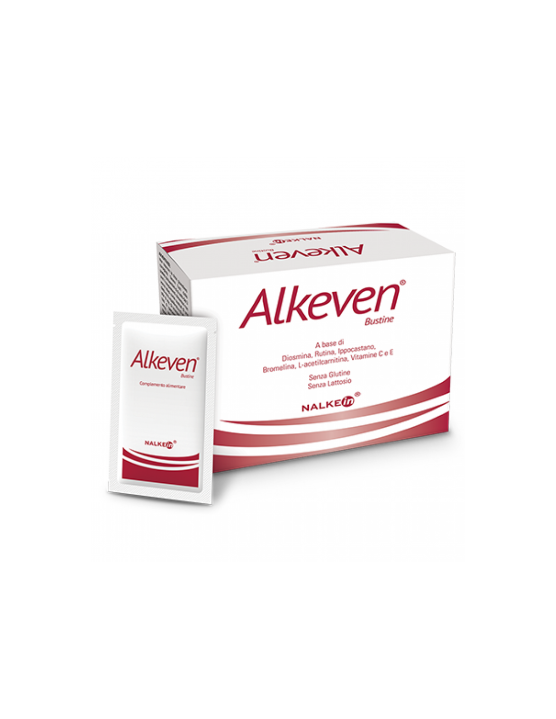 Alkeven bustine è un complemento alimentare a base di Vitamine C ed E con estratto vegetale di Ippocastano, Diosmina, Rutina, Bromelina ed L-Carnitina
