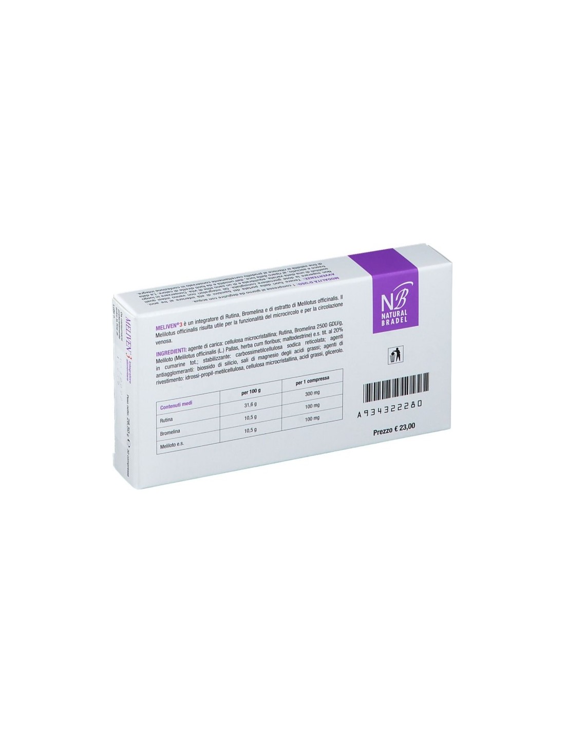 Integratore alimentare di rutina, bromelina e di estratto di meliloto. Il meliloto risulta utile per la funzionalità del microcircolo e per la circolazione venosa.