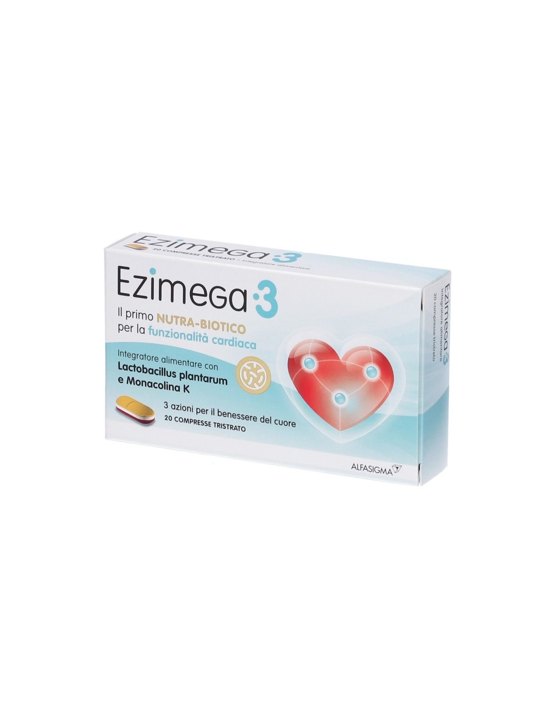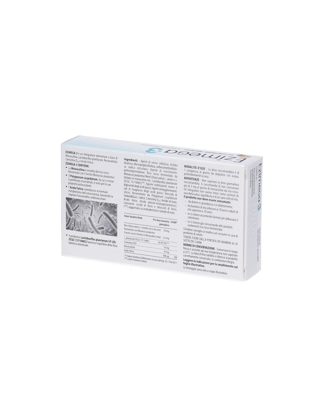 Integratore alimentare a base di monacolina K, lactobacillus plantarum, resveratrolo, coenzima Q10 e acido folico. Ezimega3 contiene: -la monacolina K é estratta dal riso rosso fermentato con il lievito Monascus purpureus. -il L. plantarum ECGC 13110402 favorisce l'equilibrio della flora batterica intestinale. -il Polygonum cuspidatum, da cui si estrae il polifenolo resveratrolo, è noto per le sue proprietà antiossidanti. -l'acido folico contribuisce al normale metabolismo dell'omocisteina, favorendo la regolare funzionalità cardiovascolare.
