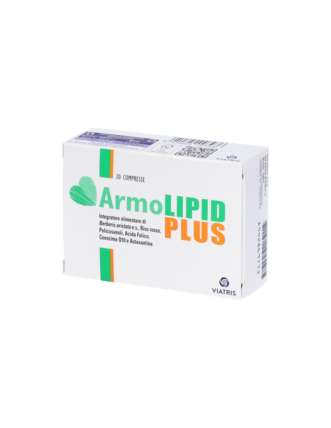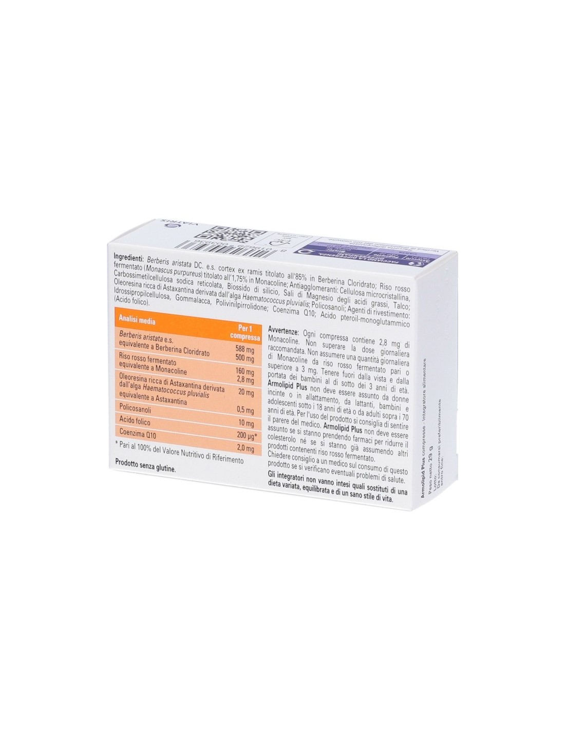 Armolipid Plus è un integratore alimentare di Berberis aristata e.s., riso rosso fermentato, policosanolo, acido folico, coenzima Q10 e astaxantina. La Berberis aristata e.s., contenuta in Armolipid Plus, favorisce il controllo del colesterolo e dei trigliceridi plasmatici ad integrazione di una dieta globalmente adeguata a tal fine. Colesterolemia e trigliceridemia: il colesterolo è prodotto dal fegato ed è presente in tutte le cellule dell'organismo. Oltre alla quota prodotta normalmente dal corpo, il colesterolo può essere introdotto dall'esterno con l'alimentazione. I trigliceridi sono introdotti principalmente con l'alimentazione ed in parte derivano dal metabolismo dei carboidrati nel fegato. Se presenti in eccesso, il colesterolo ed i trigliceridi possono essere dannosi per l'organismo e in particolare per la salute del sistema cardiovascolare. Di conseguenza, è importante in queste condizioni adottare uno stile di vita sano (ad esempio attività fisica, evitare alcol, nicotina e stress) e una dieta equilibrata.