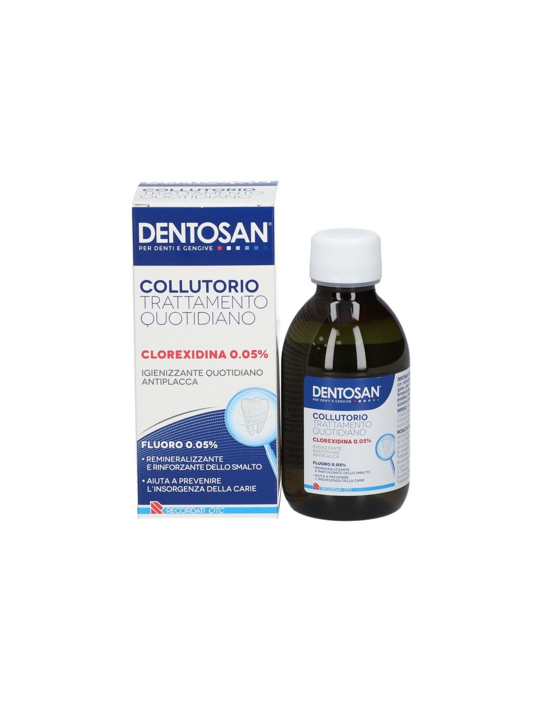 Collutorio con clorexidina 0,05%, che assicura una completa igiene orale inibendo lo sviluppo dei batteri che formano la placca, e fluoro 0,05%, che svolge un’azione protettiva, rinforzante e remineralizzante dello smalto aiutando a prevenire l’insorgenza della carie.