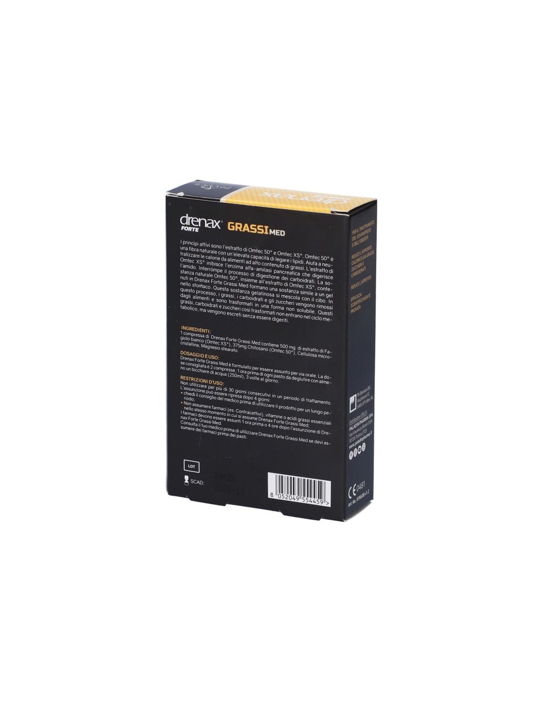 I principi attivi sono l'estratto di Omtec 50 e Omtec XS. Omtec 50 è una fibra naturale con un'elevata capacità di legare i lipidi. Aiuta a neutralizzare le calorie da alimenti ad alto contenuto di grassi. L'estratto di Omtec XS inibisce l'enzima alfa-amilasi pancreatica che digerisce l'amido. Interromper il processo di digestione dei carboidrati. La sostanza naturale Omtec 50, insieme all'estratto di Omtec XS, contenuti in Drenax Forte Grassi Med formano una sostanza simile a un gel nello stomaco. Questa sostanza gelatinosa si mescola con il cibo. In questo processo, i grassi, carboidrati e zuccheri così trasformati non entrano nel ciclo metabolico, ma vengono escreti senza essere digeriti.