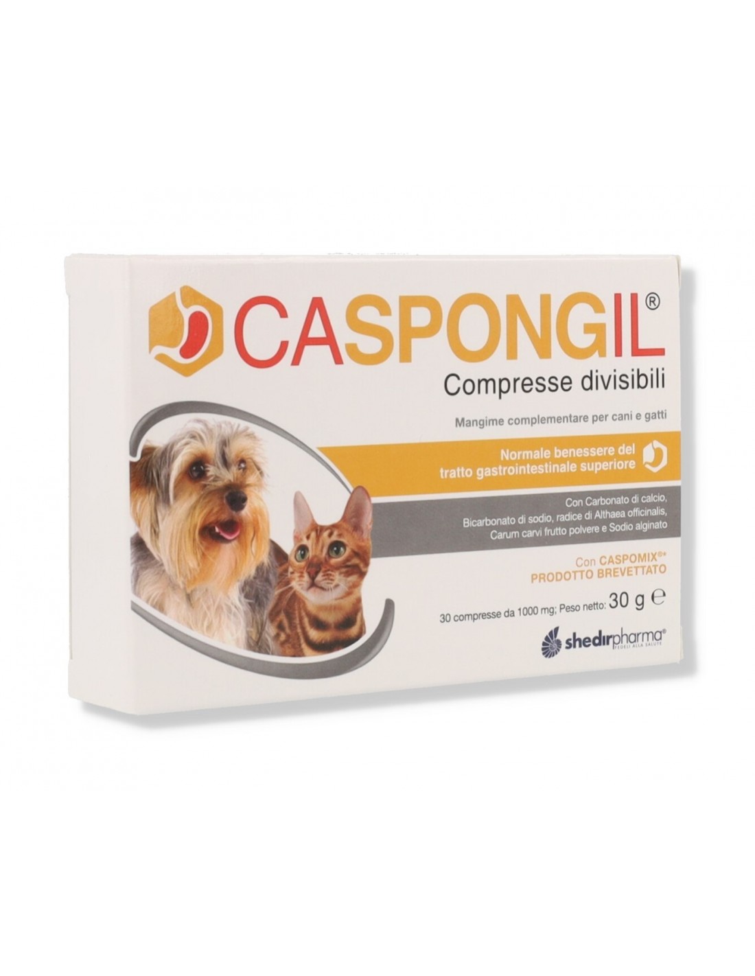 Caspongil compresse appetibili e divisibili, a base di Caspomix*, radice di Althaea officinalis e Carum carvi frutto povere *miscela brevettata di Carbonato di calcio, Bicarbonato di sodio, Ananas (Ananas comosus) estratto, Liquirizia (Glycyrrhiza glabra L.) estratto polvere, Sodio alginato.