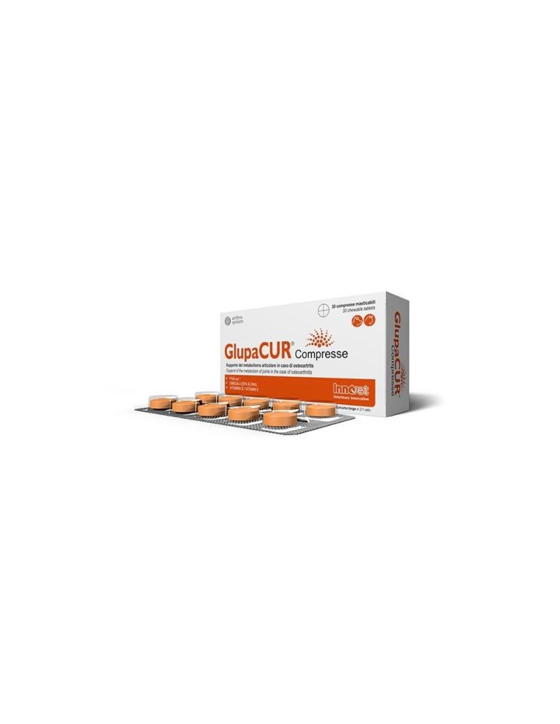 Supporto del metabolismo articolare in caso di osteoartrite. Indicato per cani e gatti di ogni età affetti da osteoartrite. Grazie all'esclusivo micro composito formato da palmitoilglucosamina ed estratto di curcuma, Glupacur supporta il metabolismo articolare di cani e gatti affetti da osteoartrite, migliorandone la qualità di vita.