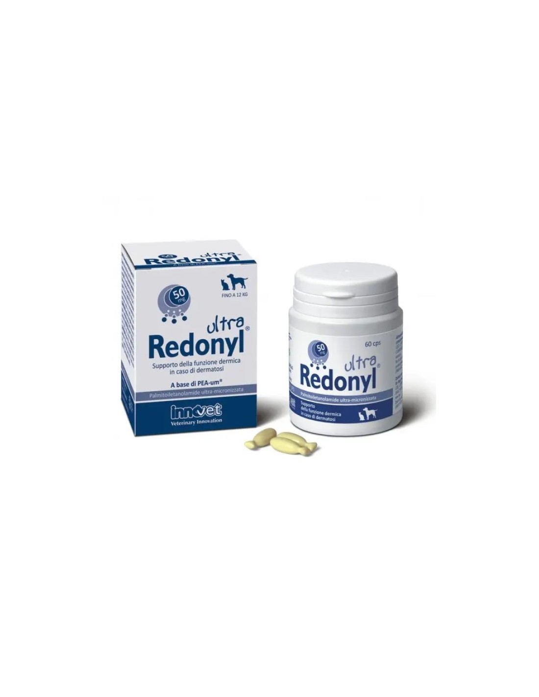Supporto della funzione dermica in caso di dermatosi. Redonyl Ultra è un alimento dietetico per cani e gatti in caso di dermatosi. Il contenuto di PEA-um (palmitoiletanolamide ultra-micronizzata) aiuta a mantenere la fisiologica funzione del mastocita dermico. Si raccomanda di chiedere il parere di un medico veterinario prima dell'uso.