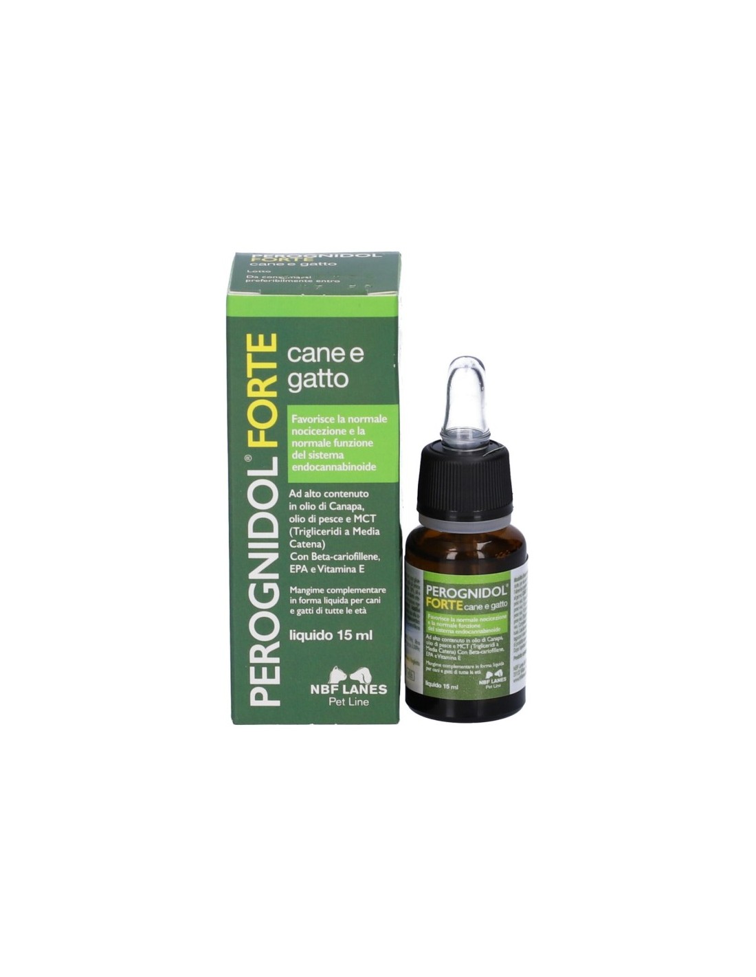 Il fitocomplesso presente nell'alto contenuto in olio di canapa, in combinazione con EPA da olio di pesce e vitamina E, favoriscono la normale funzione nocicettiva nell'animale. Perognidol Forte, che contiene beta-cariofillene, è stato appositamente formulato per favorire la normale funzione del sistema endocannabinoide nell'animale.