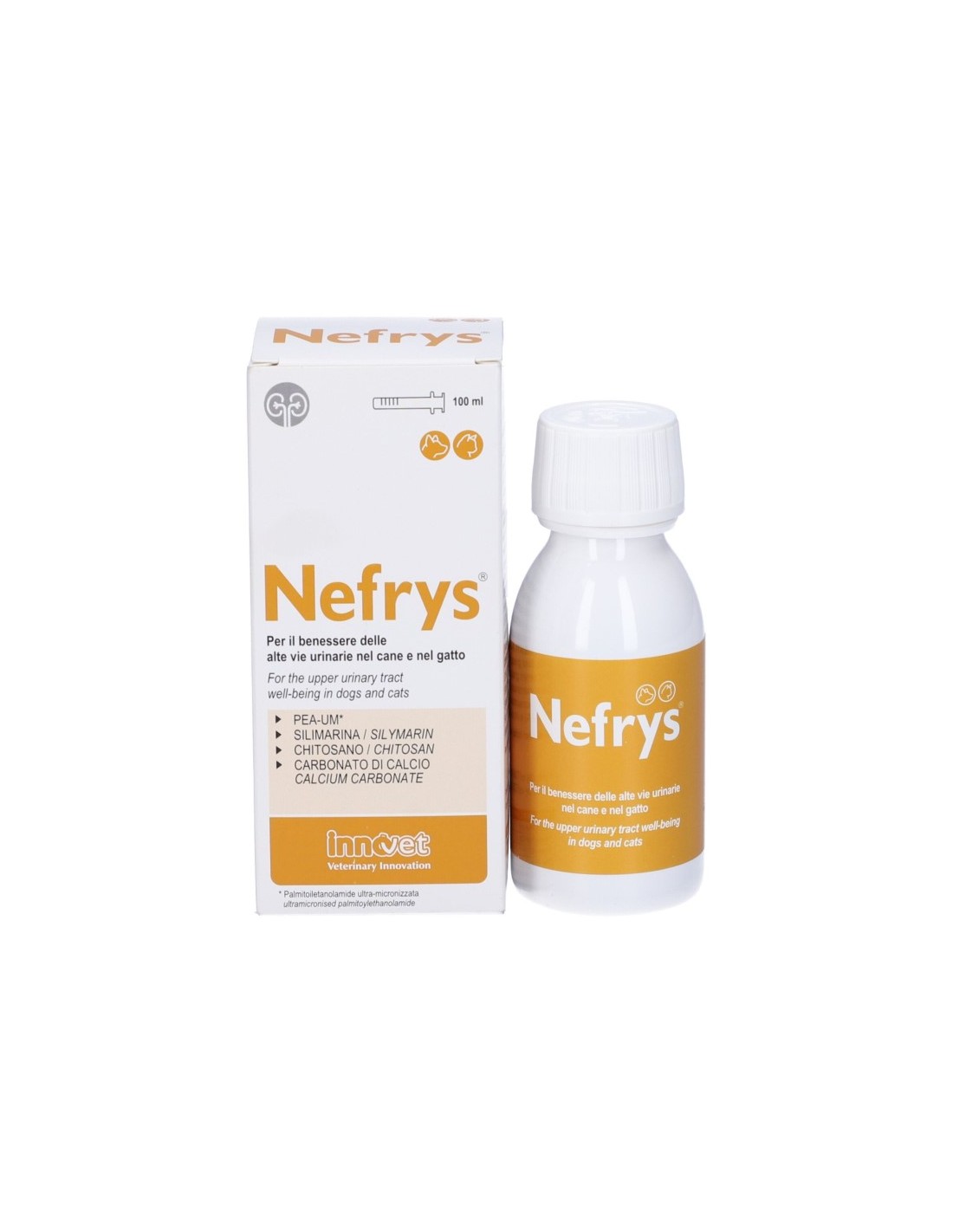 La PEA (palmitoiletanolamide) è una sostanza naturale presente in molte fonti alimentari di origine sia animale che vegetale (esempio soia). Nell'organismo animale, aiuta a mantenere l'equilibrio fisiologico di molti organi e tessuti (esempio rene). Nefrys reintegra le riserve endogene di PEA nella sua forma a più alto assorbimento (ultra-micronizzata, PEA-um). Il chitosano e il carbonato di calcio aiutano a mantenere, nel tratto intestinale, un corretto livello di fosforo e di prodotti della digestione delle proteine (esempio scorie azotate). Contiene una fonte di silimarina.