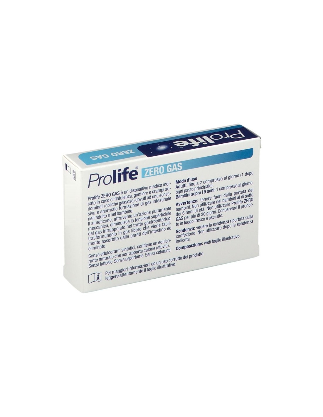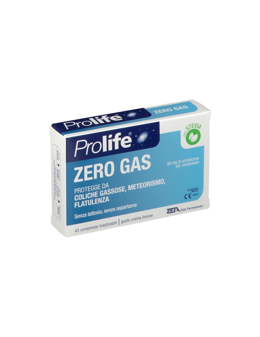 Dispositivo medico indicato in caso di flatulenza, gonfiore e crampi addominali (coliche gassose) dovuti ad una eccessiva e anormale formazione di gas intestinale nell'adulto e nel bambino. Prolife zero gas si può utilizzare anche per l'eliminazione del gas in preparazione ad esami diagnostici dell'area addominale. Prolife Zero gas assunto dopo i pasti principali protegge da coliche gassose, meteorismo e flatulenza. Il simeticone, attraverso un’azione puramente meccanica, diminuisce la tensione superficiale del gas intrappolato nel tratto gastroenterico, trasformandolo in gas libero che viene facilmente assorbito dalle pareti dell’intestino ed eliminato. La sua forma in compresse masticabili rende l’assunzione del prodotto pratica.