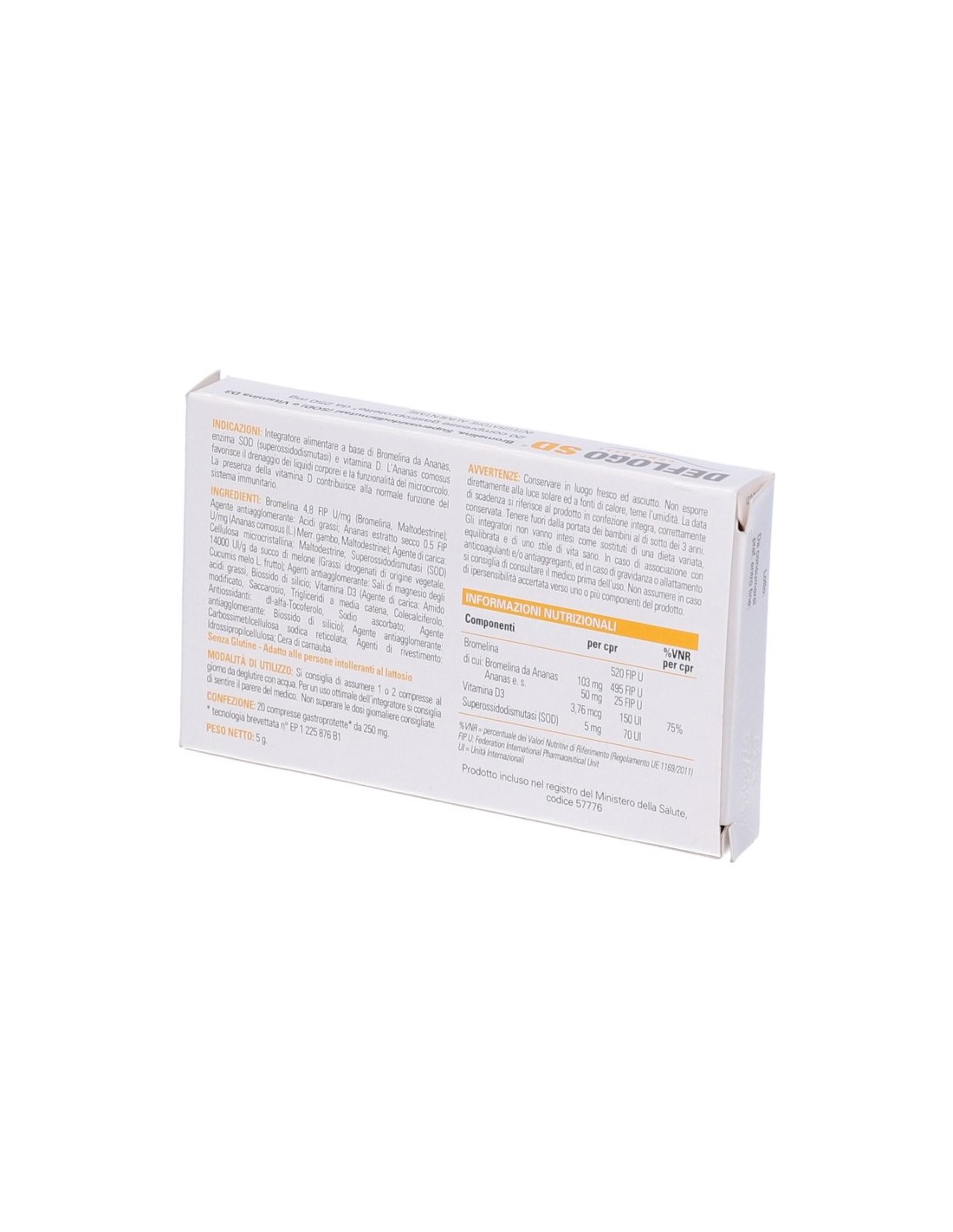 Bromelina 2,0 FIP U/mg (Bromelina, Agenti di carica: Cellulosa microcristallina, Maltodestrina); Agente antiagglomerante: Acidi grassi; Maltodestrina; Ananas estratto secco 0,5 FIP U/mg (Ananas comosus (L.) Merr. gambo, Maltodestrine); Agenti di carica: Cellulosa microcristallina, Calcio fosfato; Superossido dismutasi (SOD) da succo di melone (Grassi idrogenati di origine vegetale, Cucumis melo L. frutto); Agente di rivestimento: Idrossipropilmetilcellulosa; Agenti antiagglomeranti: Sali di Magnesio degli acidi grassi, Biossido di silicio; Colecalciferolo (Vitamina D3, Amido di mais modificato, Saccarosio, Trigliceridi a media catena, Antiossidanti: dl-Alfa-Tocoferolo, Sodio ascorbato); Agente di rivestimento: Gomma lacca; Colorante: Titanio biossido; Agente antiagglomerante: Talco; Colorante: Riboflavina; Agente di rivestimento: Cera di carnauba; Colorante: Ossidi di ferro.