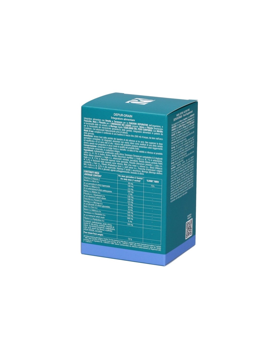 Integratore alimentare con betulla e tarassaco per le funzioni depurative dell’organismo, e finocchio, mais e pilosella per il drenaggio dei liquidi corporei. Ibisco e fillanto favoriscono la funzionalità delle vie urinarie, la Moringa regola l’equilibrio del peso corporeo. Con mirtillo per la funzionalità del microcircolo (pesantezza delle gambe). Integratore alimentare in polvere da ricostituire.