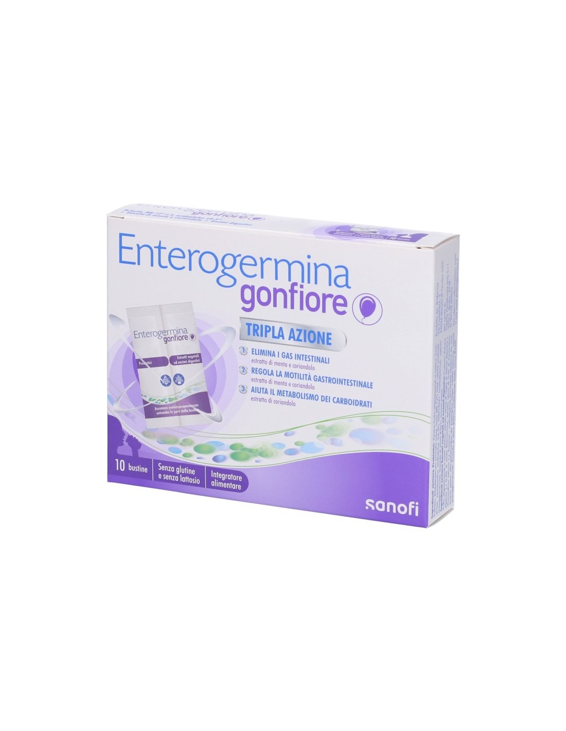 Enterogermina gonfiore è un integratore alimentare con formulazione specifica tripla azione a base di probiotici, estratti vegetali ed enzimi digestivi.