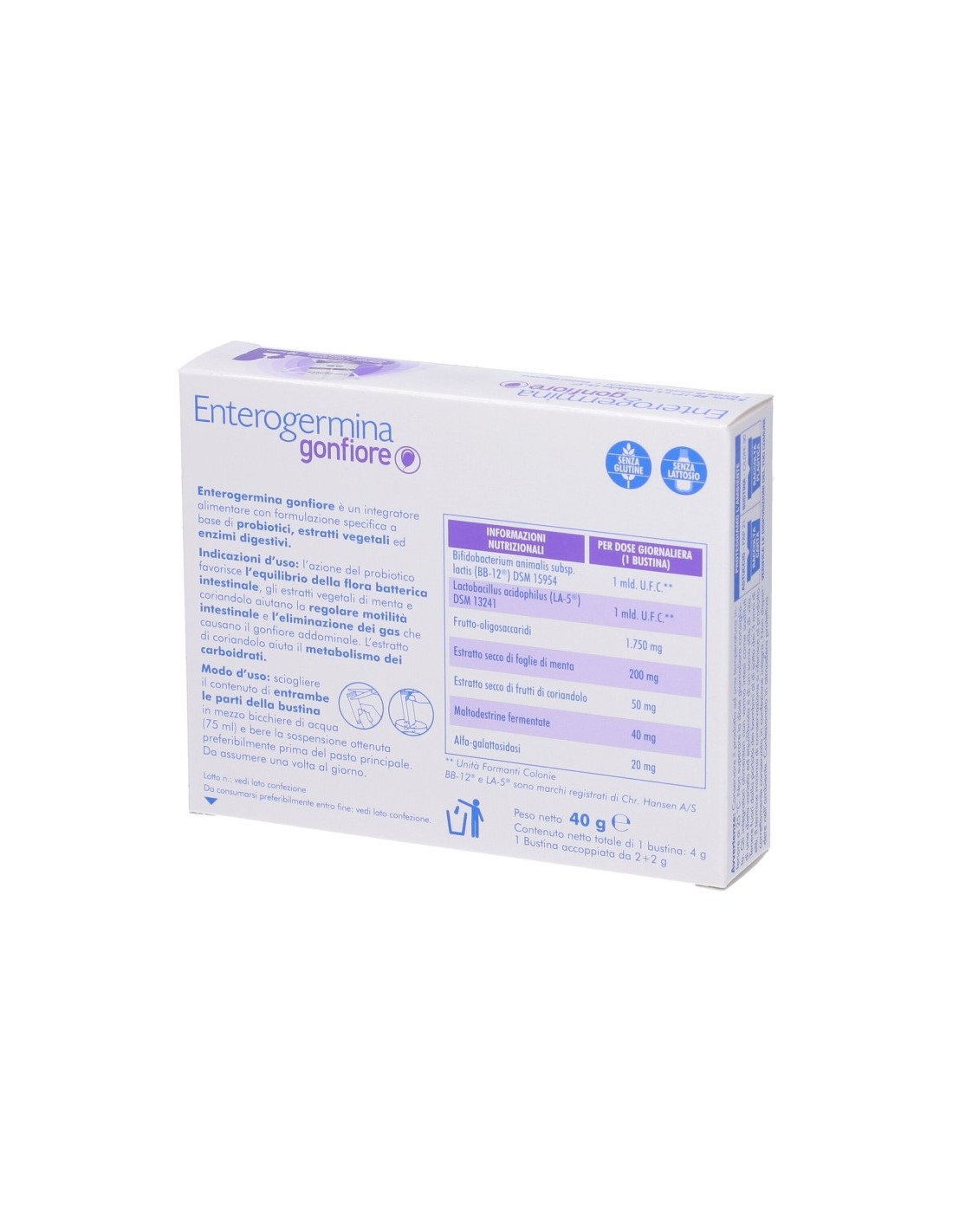Questo è il motivo per cui Enterogermina gonfiore è composto da bustine accoppiate che permettono la conservazione separata dei due nutrienti fino al momento dell’assunzione.