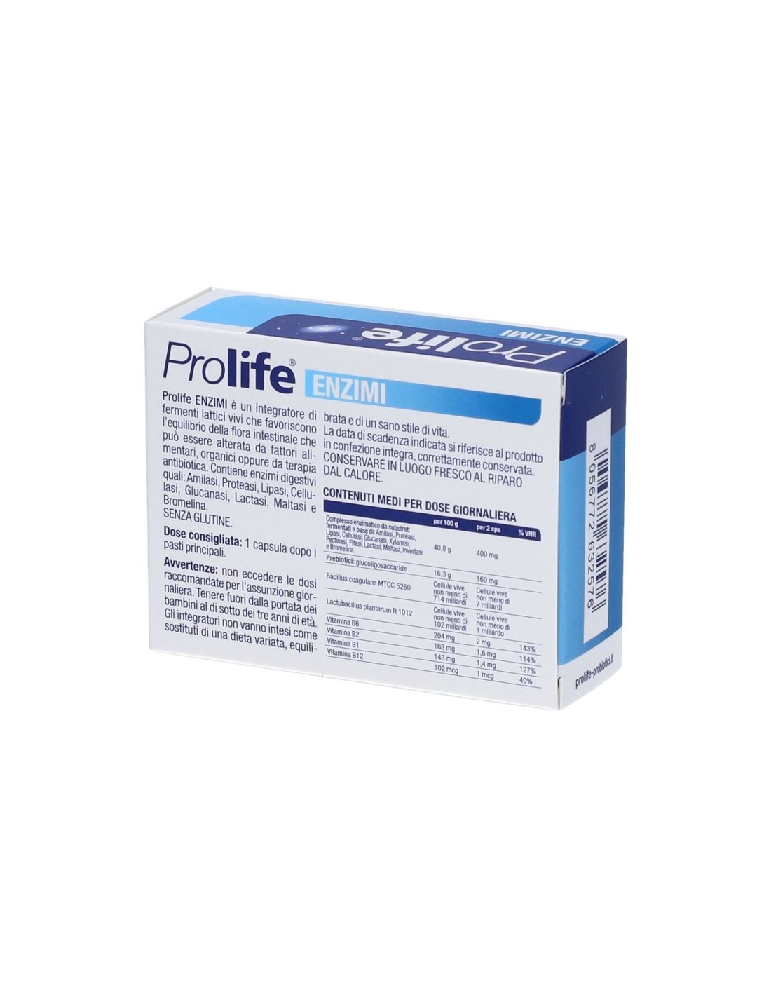 Contenuto interno: complesso enzimatico da substrati vegetali fermentati a base di: amilasi, proteasi, lipasi, cellulasi, glucanasi, xylanasi, pectinasi, fitasi, lactasi, maltasi, invertasi, bromelina; glucoligosaccaride; agente di carica: cellulosa; fermenti lattici vivi (Bacillus coagulans MTCC 5260, Lactobacillus plantarum R 1012*); agenti antiagglomeranti: magnesio stearato, biossido di silicio; vitamina B6 (cloridrato di piridossina), vitamina B2 (riboflavina), vitamina B1 (cloridrato di tiamina), vitamina B12 (cianocobalamina).