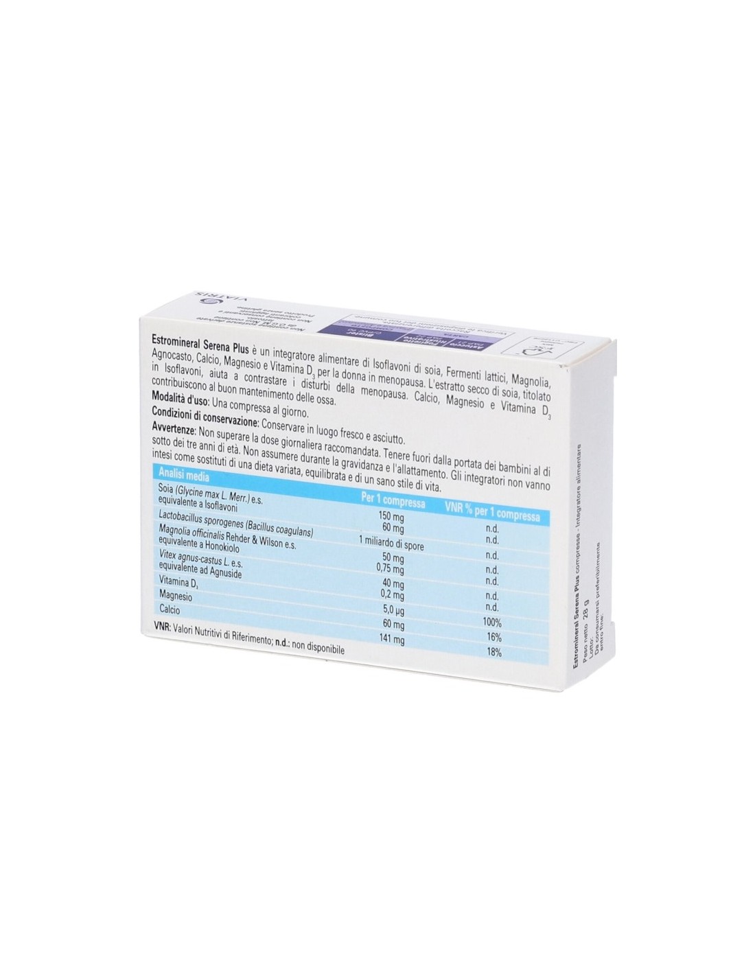 Carbonato di calcio, soia [Glycine max (L.) Merr., semen] estratto secco titolato al 40% in isoflavoni; stabilizzante: cellulosa microcristallina; ossido di magnesio, magnolia (Magnolia officinalis Rehder & Wilson, cortex) estratto secco titolato all'1,5% in honokiolo; agenti antiagglomeranti: carbossimetilcellulosa sodica reticolata, sali di magnesio degli acidi grassi, biossido di silicio; agnocasto (Vitex agnus-castus L., fructus) estratto secco titolato al 0,5% in agnuside, Lactobacillus sporogenes (Bacillus coagulans LMG-S-24828) (2,105%)*, colecalciferolo (vitamina D3).