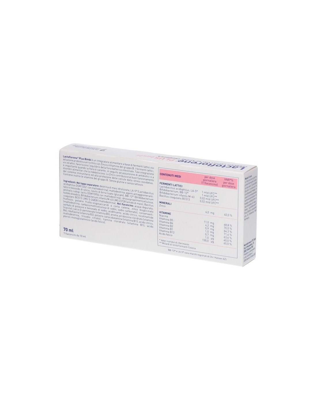 Tappo separatore: miscela Florene [composto Probiotech ABC (lactobacillus acidophilus, LA-5 DSM13241; bifidobacterium, BB-12 DMS15954; lactobacillus paracasei CRL431 ATCC55544 su maltodestrina e sodio alginato); bacillus coagulans BC513 (su maltodestrina)]; mannitolo; lievito di birra lisato (glucani); bifidobacterium infantis BB-02 (su maltodestrina e biossido di silicio); nicotinamide (niacina); antiagglomerante (biossido di silicio); calcio D-pantotenato (vitamina B5); idrossipropilmetilcellulosa; sodio fosfato; piridossina cloridrato (vitamina B6); riboflavina (vitamina B2); cianocobalamina (vitamina B12 con acido citrico, citrato di sodio, maltodestrina); tiamina cloridrato (vitamina B1); acido pteroil-monoglutammico (acido folico).