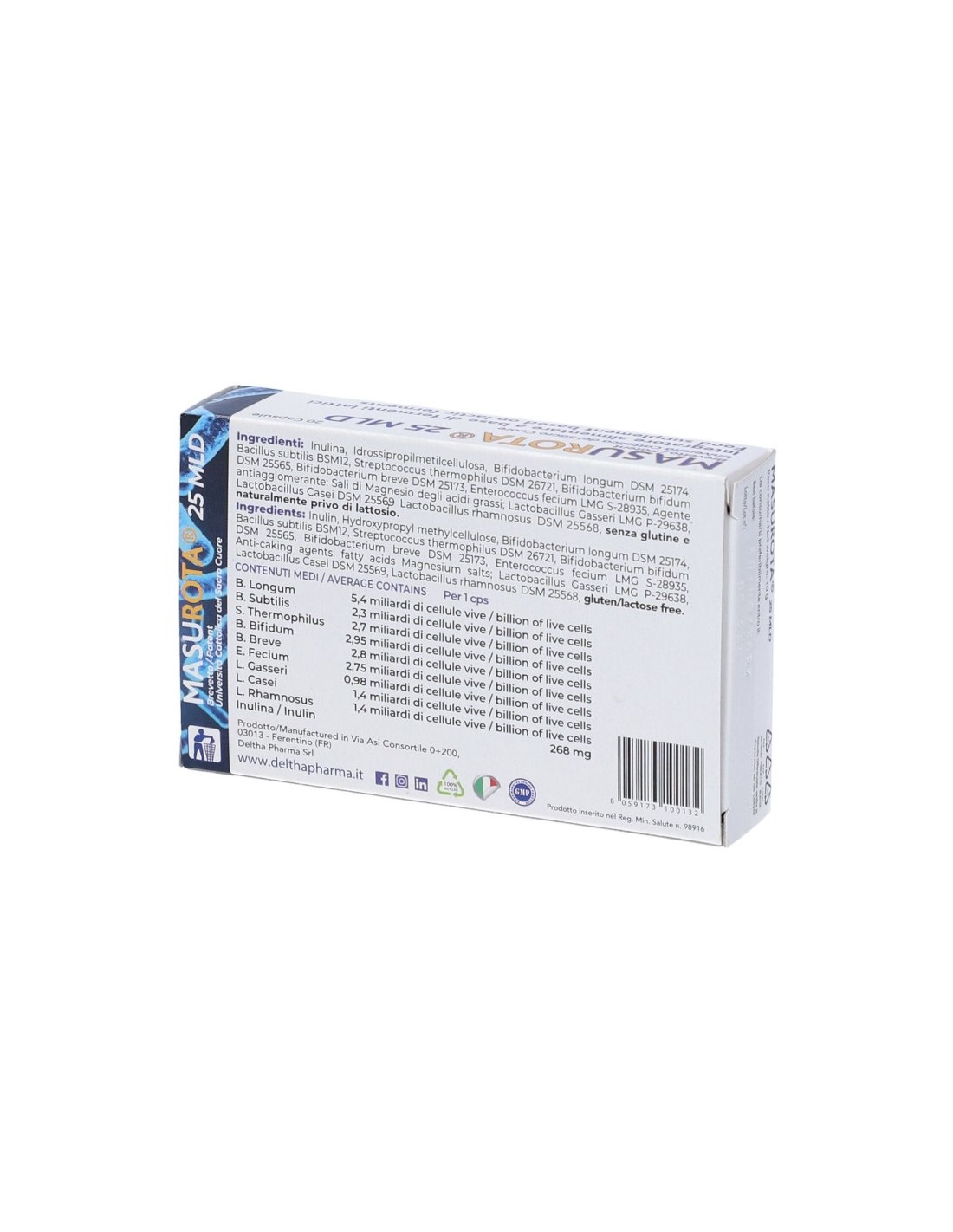 Inulina, idrossipropilmetilcellulosa, Bifidobacterium longum DSM 25174, Bacillus subtilis BSM12, Streptococcus thermophilus DSM 26721, Bifidobacterium bifidum DSM 25565, Bifidobacterium breve DSM 25173, Enterococcus fecium LMG S-28935; agente antiagglomerante: sali di magnesio degli acidi grassi; Lactobacillus gasseri LMG P-29638, Lactobacillus casei DSM 25569, Lactobacillus rhamnosus DSM 255668.