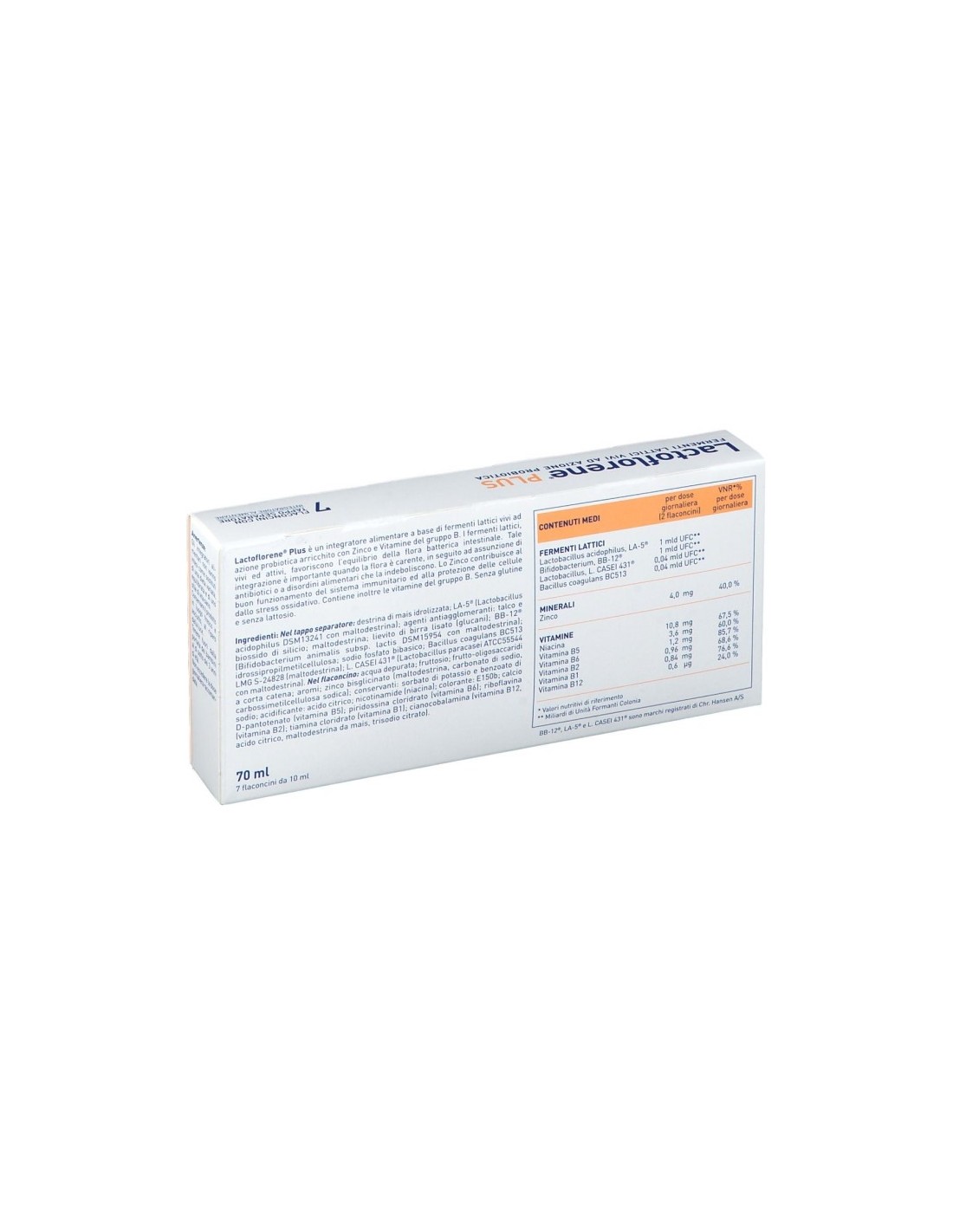 Miscela florene di fermenti lattici vivi: Lactobacillus acidophilus LA-5, Bifidobacterium BB12, Lactobacillus paracasei L. Casei 431, Bacillus coagulans BC513; zinco, vitamine del gruppo B.
