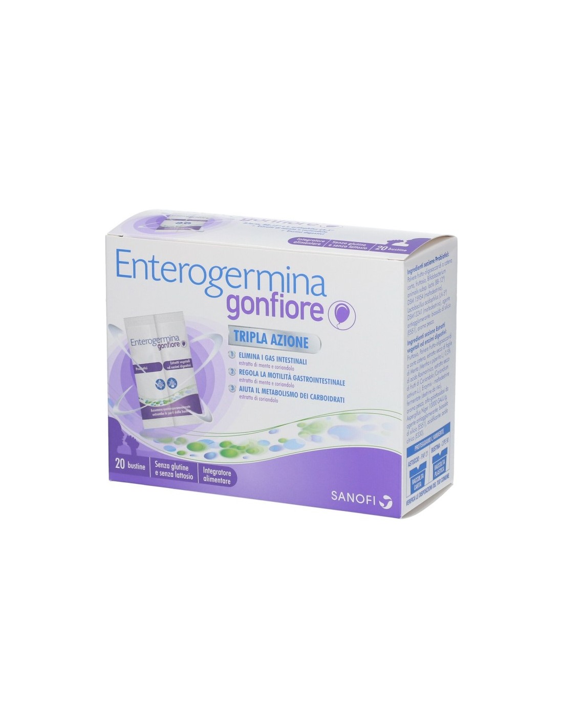 Enterogermina gonfiore è composto da bustine accoppiate che permettono la conservazione separata dei due nutrienti fino al momento dell’assunzione.