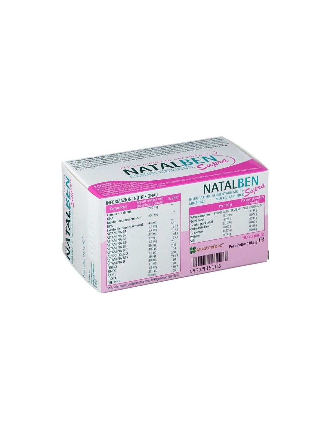 Natalben Supra è un integratore alimentare. Non sue Non superare la dose giornaliera raccomandata. Tenere fuori dalla portata dei bambini al di sotto dei 3 anni di età. Gli integratori non vanno intesi come sostituti di una dieta varia ed equilibrata ed uno stile di vita sano. Il prodotto contiene pesce. L'integrazione alimentare in gravidanza va suggerita dal medico.