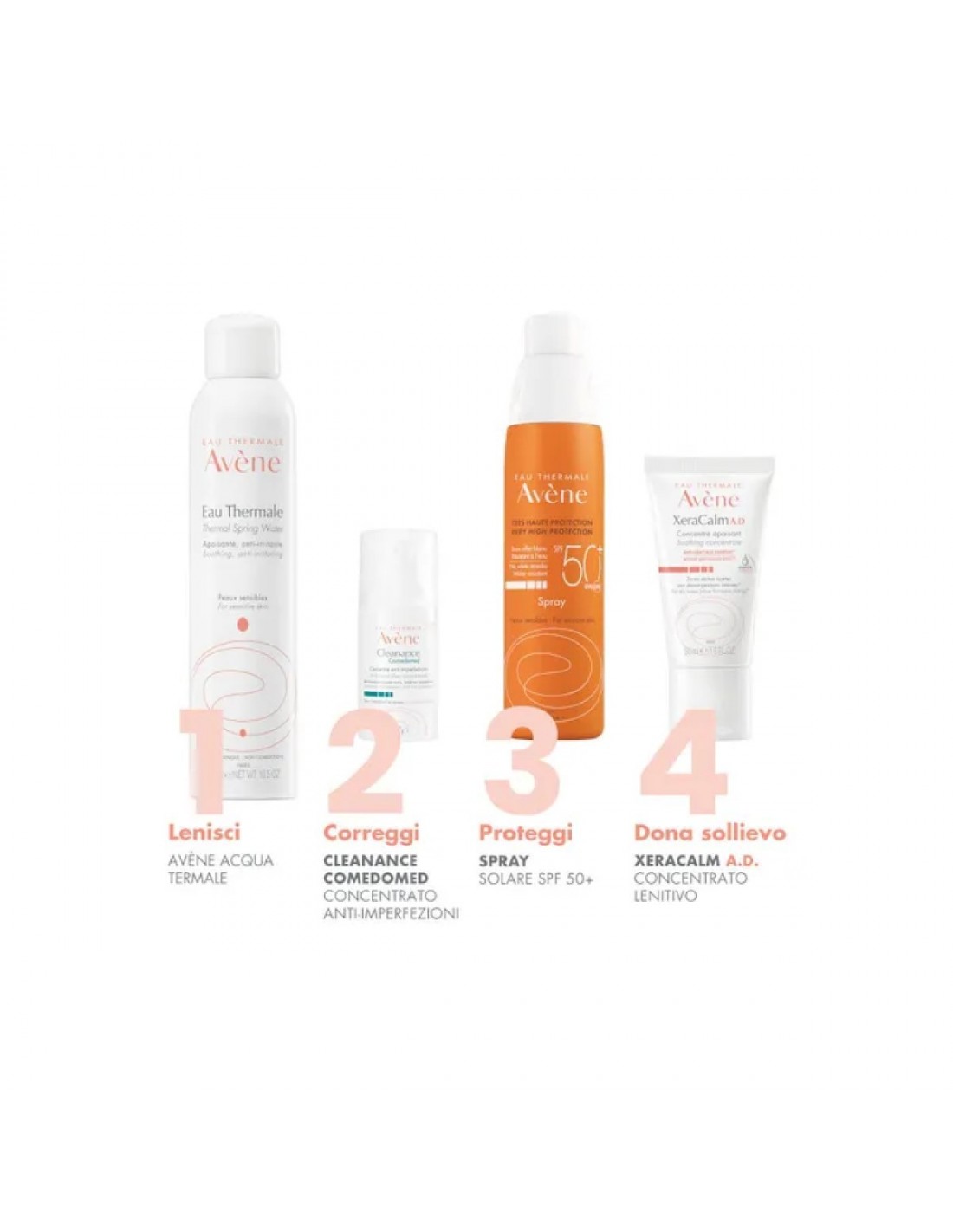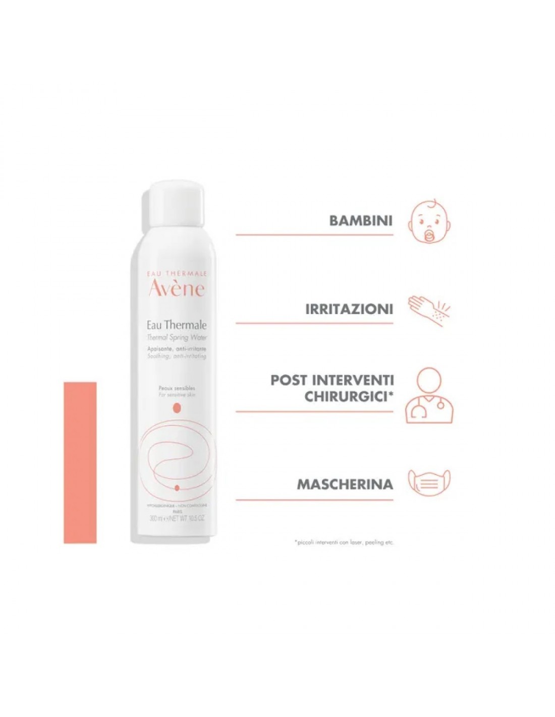 - Vaporizzazione lenitiva: l'Acqua termale Avène restituisce tutte le proprietà lenitive ed addolcenti (dopo la depilazione o la rasatura, arrossamenti del viso e dei glutei dei neonati, pelle fragilizzata, post-acta, pelle arrossata dal sole, dopo un arrossamento intenso).