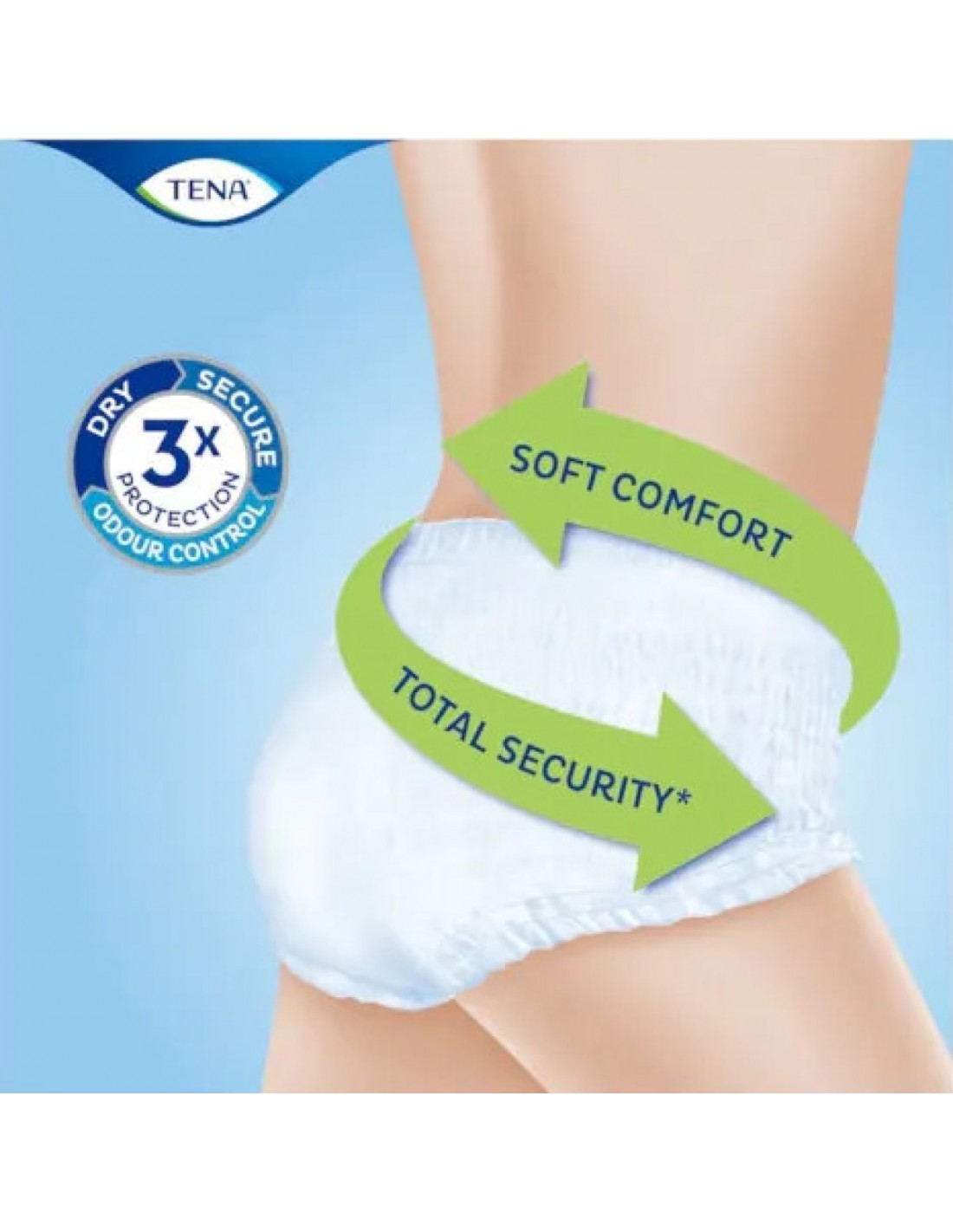 TENA ti offre Tripla Protezione da perdite, odori e sensazione di bagnato sulla pelle.