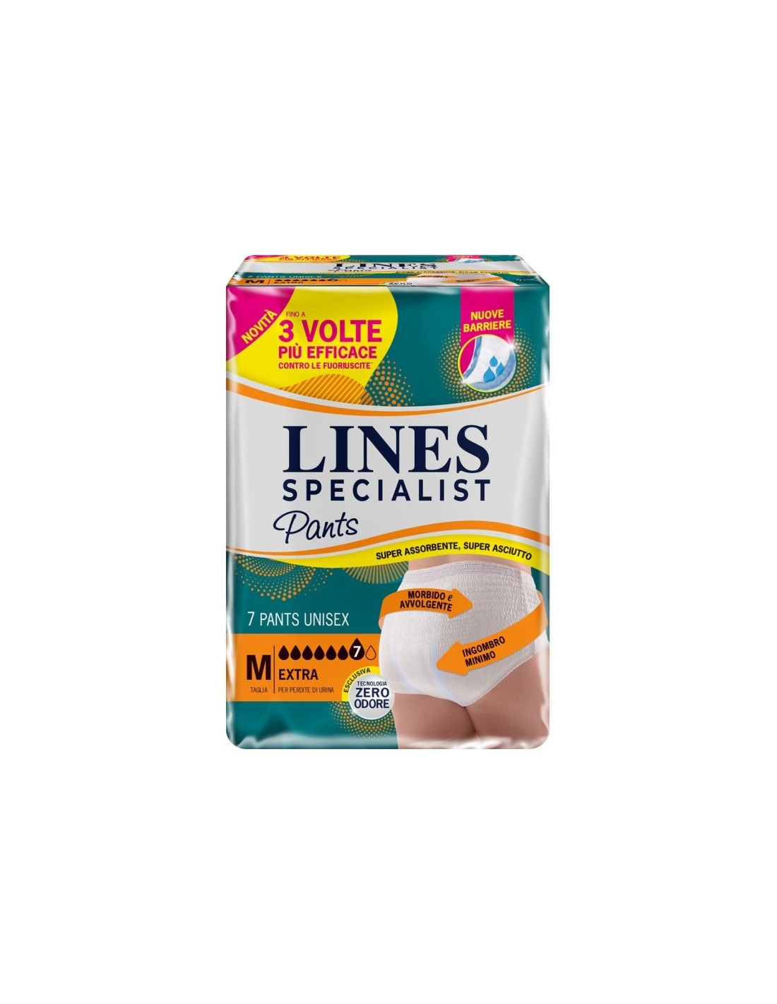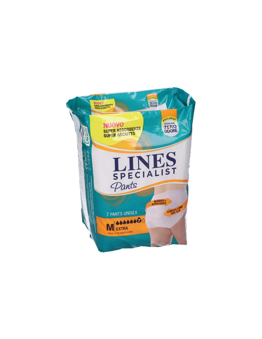 I pants Lines Specialist Unisex Extra offrono super comfort e minimo ingombro: hanno un design discreto ed il minimo ingombro nella zona inguinale, permettendo al prodotto di conformarsi meglio al corpo, per una elevata sensazione di comfort. Queste mutandine assorbenti, garantiscono un asciutto lampo grazie alla struttura a strati, studiata per mantenere la pelle asciutta e sana e per offrirti un'assorbenza veloce dei liquidi, che rimangono lontani dalla pelle. Grazie al sistema Zero Odore*, l'odore viene intercettato, bloccato e neutralizzato per una discrezione incredibile! Le barriere laterali, morbide e delicate a contatto con la pelle, aiutano a prevenire le fuoriuscite. I pants Lines Specialist Unisex, ipoallergenici e con ossido di zinco, rispettano l'equilibrio naturale della pelle.