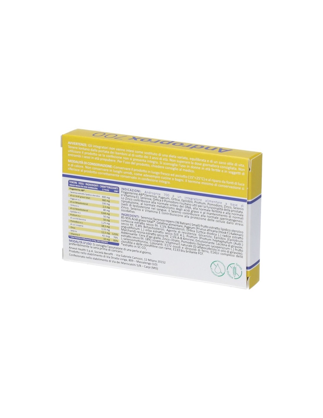 Serenoa (Serenoa repens (W.Batram) Small) frutto estratto lipidico-sterolico 85-95% acidi grassi totali in estrazione in CO2 supercritica, gelatina alimentare; agente di resistenza: glicerolo; pygeum (Prunus africana kalkm-Pygeum africanum Hooker) betasitosteroli, ortica (Urtica dioica L.) betasitosterolo; emulsionante: lecitina di girasole; addensante: cera d'api gialla; zinco citrato, pomodoro (Solanum Lycopersicum L.) licopene, vitamina E naturale (D-alfatocoferolo in olio di girasole), L-seleniometionina; coloranti: biossido di titanio, ossido di ferro e complessi delle clorofille e delle clorofilline con rame.