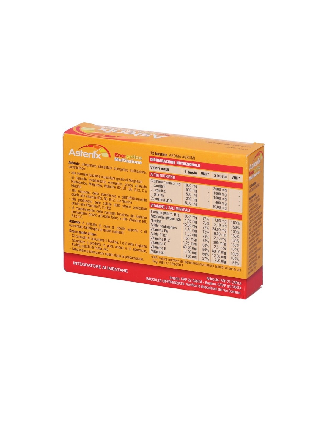 Astenix è un integratore alimentare ad attività proenergetica costituito da creatina, carnitina, arginina, taurina, vitamine del gruppo B, potassio, magnesio, vitamine C ed E, coenzima Q10.