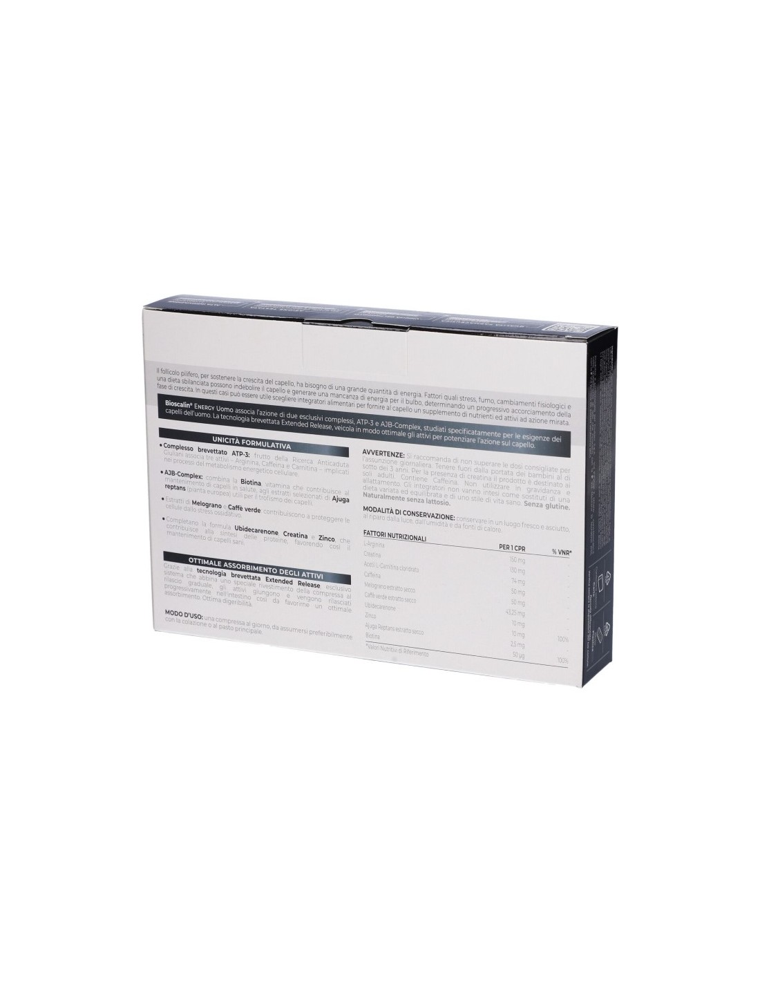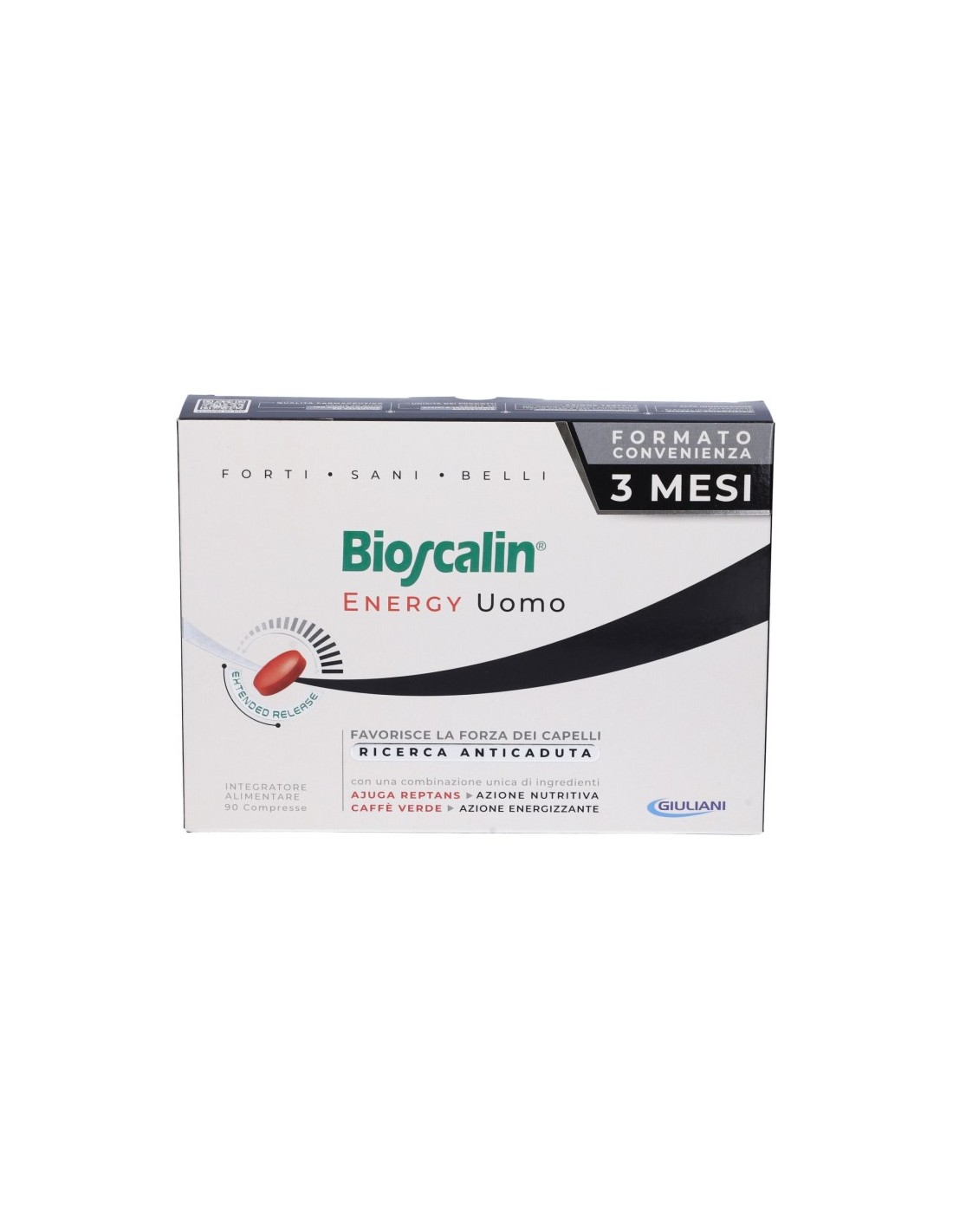 Integratore alimentare utile per i capelli dell'uomo, che associa l'azione combinata dei due esclusivi complessi ATP-3 e AJB-Complex, alla tecnologia brevettata R-Plus, in grado di veicolare in modo ottimale tutti gli attivi e massimizzare l'assorbimento, potenziandone l'azione sul capello. Frutto della Ricerca Anticaduta Giuliani, l'esclusivo complesso brevettato ATP-3 associa tre attivi: Arginina, Caffeina e Carnitina, implicati nei processi del metabolismo energetico cellulare. L'AJB-Complex combina la Biotina, vitamina che contribuisce al mantenimento di capelli normali, agli estratti selezionati di Ajuga reptans (pianta europea) utili per il trofismo dei capelli. Contiene Ubidecarenone, Creatina e Zinco, nutrienti utili per i capelli. La presenza degli estratti di Melograno e Caffè verde contribuisce a proteggere le cellule dallo stress ossidativo. Grazie alla tecnologia R-Plus Bioscalin ottimizza la disponibilità degli attivi sul bulbo, centro vitale del capello. Lo speciale rivestimento della compressa, che la protegge dai succhi gastrici, abbinato al rilascio graduale, permette agli attivi di arrivare integri nell'intestino, dove inizia la loro assimilazione in modo graduale. Il risultato è la massimizzazione della disponibilità degli attivi e un ottimale assorbimento, per una loro efficace azione sul capello.