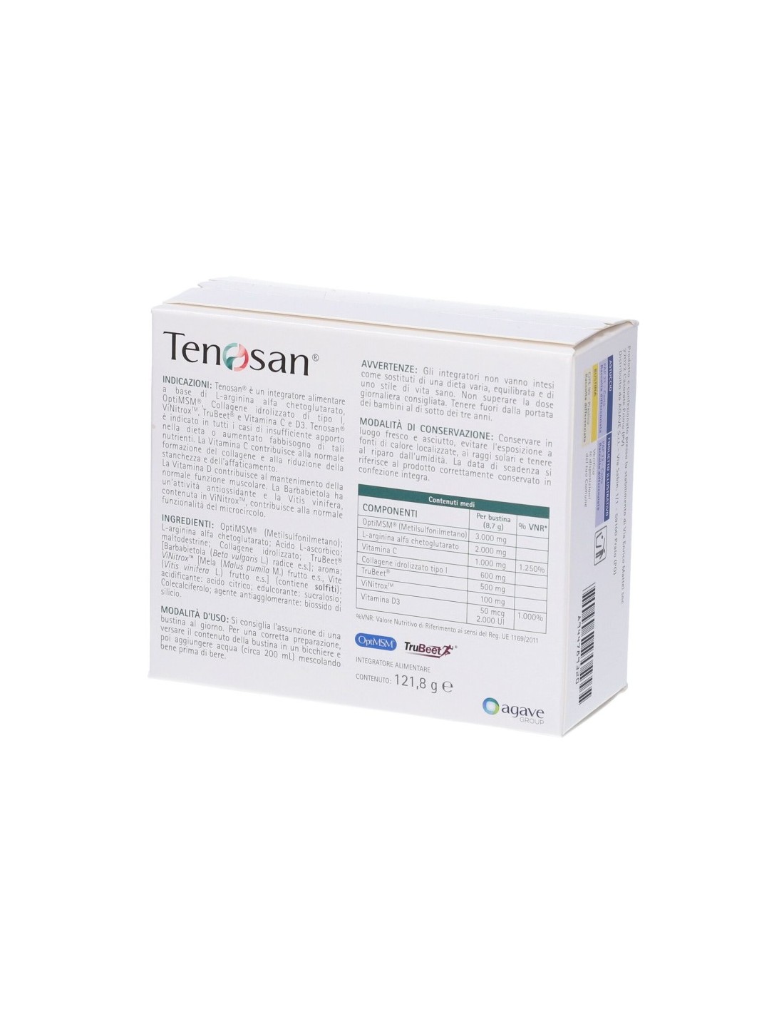 Integratore alimentare a base di L-arginina alfa chetoglutarato, OptiMSM, collagene idrolizzato di tipo I, ViNitrox, TruBeet, vitamine C e D3. Tenosan è indicato in tutti i casi di insufficiente apporto nella dieta o aumentato fabbisogno di tali nutrienti.