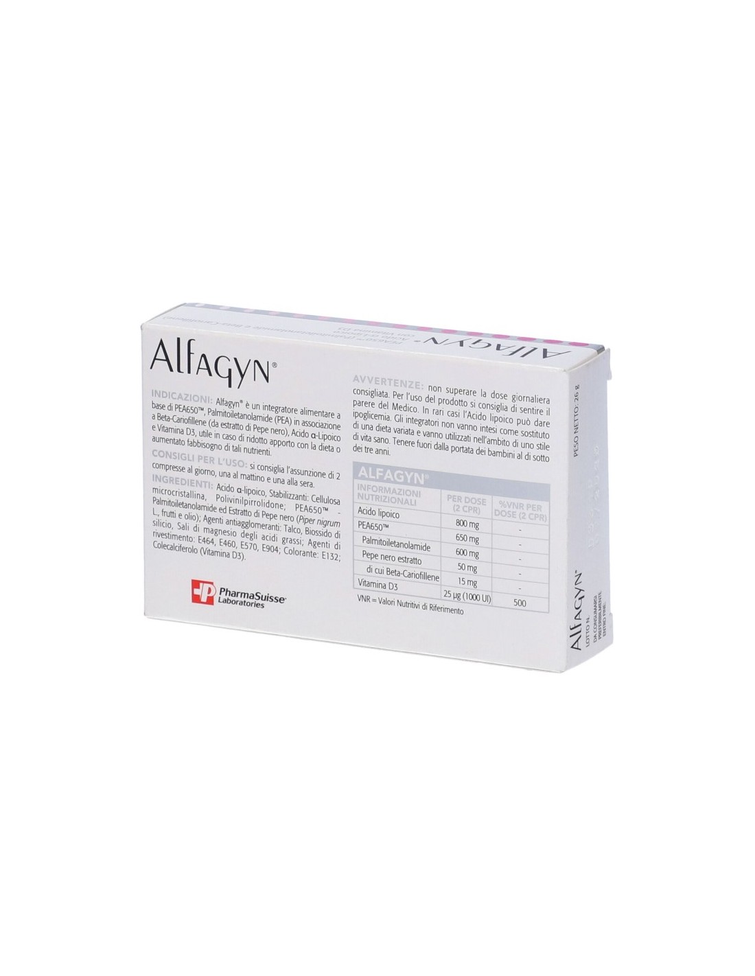 Acido alpha-lipoico; stabilizzanti: cellulosa microcristallina, polivinilpirrolidone; PEA650-palmitoiletanolamide ed estratto di pepe nero (piper nigrum l., frutti e olio) (supporto: amido di riso); agenti antiagglomeranti: biossido di silicio, talco, sali di magnesio degli acidi grassi; agenti di rivestimento: E464, E904, E460, E570; coloranti: E171, E132; colecalciferolo (supporti: saccarosio, amido di mais, olio vegetale).
