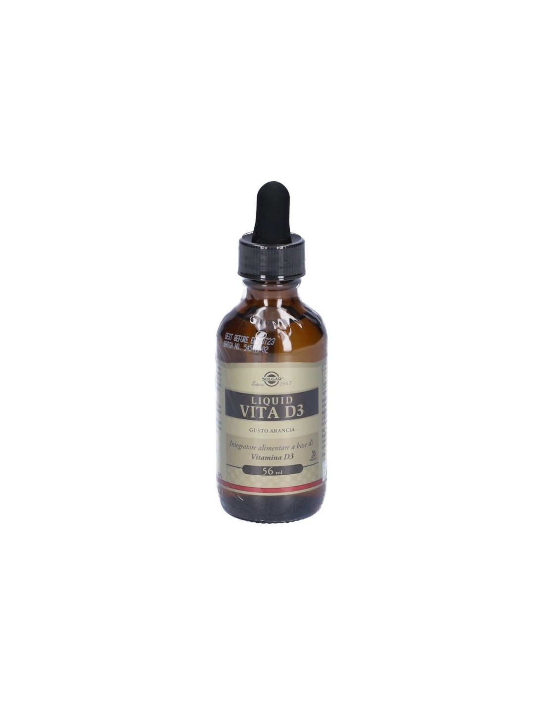 Integratore alimentare a base di vitamina D3 adatta anche ai vegetariani. La vitamina D viene prodotta a livello della cute in seguito a esposizione solare e la sua sintesi può ridursi in particolare durante i mesi invernali, quando invece l’esposizione diviene più modesta. La vitamina D contribuisce al normale assorbimento e utilizzo del calcio e del fosforo, minerali utili per la funzionalità neuromuscolare e la mineralizzazione ossea. Contribuisce quindi al mantenimento di ossa e denti normali. La vitamina D inoltre contribuisce alla normale funzione del sistema immunitario e sostiene la regolare funzionalità muscolare. LIQUID VITA D3 è un integratore alimentare contenente Vitamina D3 liquida al gusto d’arancia. La pratica confezione in gocce permette di scegliere la quantità di vitamina D ideale per ogni esigenza. Si consiglia di assumere la vitamina D ai pasti aggiungendo le gocce a un poco di latte, yogurt o ad un pezzo di pane.