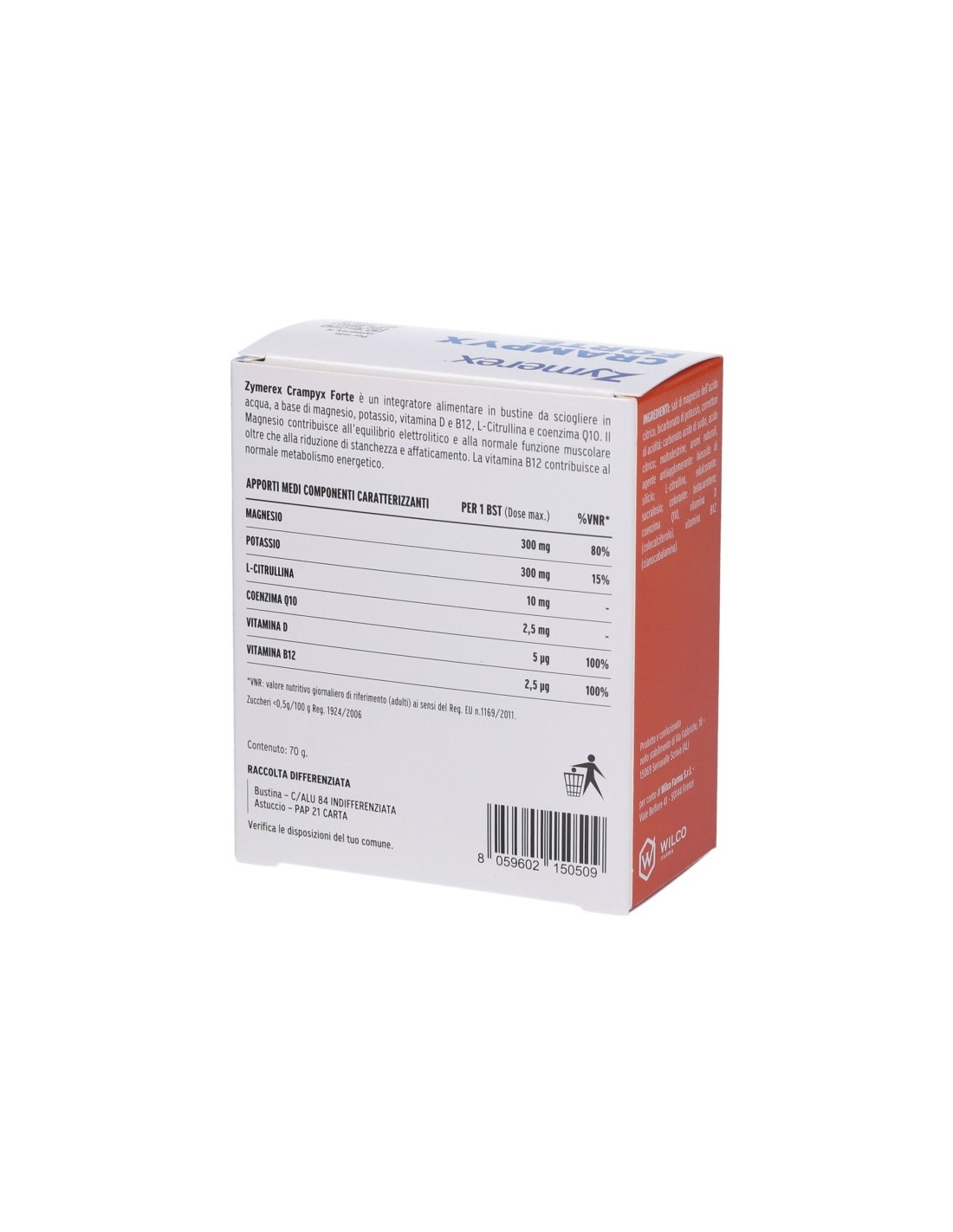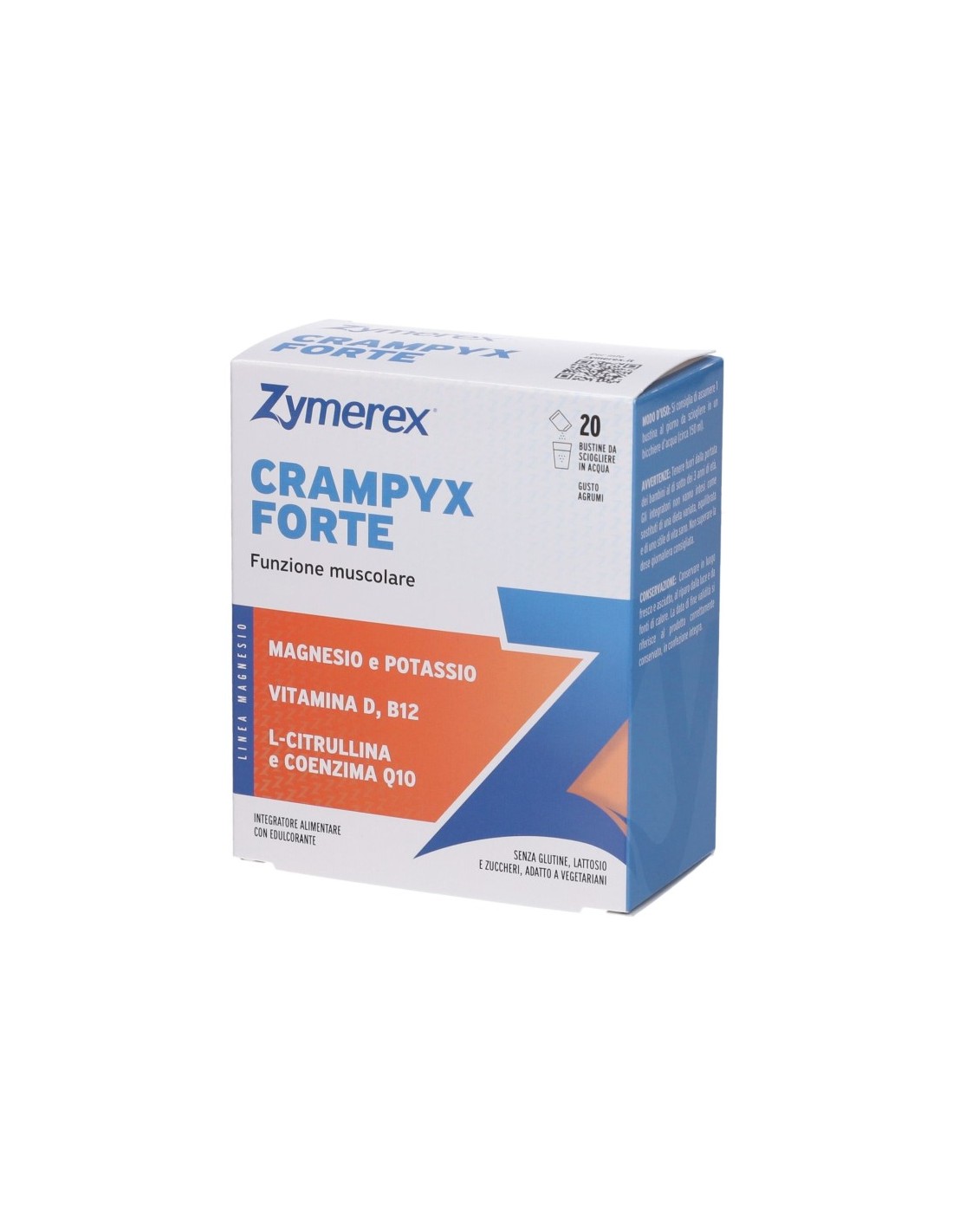 Zymerex Crampyx Forte è un integratore alimentare in bustine da sciogliere in acqua, a base di magnesio, potassio, vitamina D e B12, L-Citrullina e coenzima Q10. Il Magnesio contribuisce all’equilibrio elettrolitico e alla normale funzione muscolare oltre che alla riduzione di stanchezza e affaticamento. La vitamina B12 contribuisce al normale metabolismo energetico.