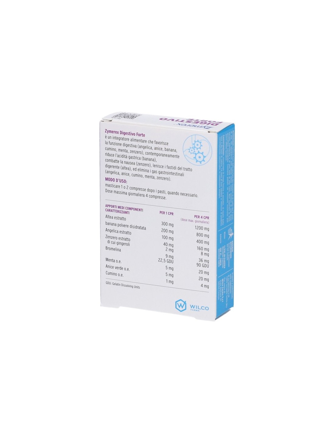 Edulcoranti: sorbitolo, xilitolo, sucralosio; altea (Althaea of cinalis L.) radice e.s. 4:1, banana [Musa paradisiaca L. (pro sp.)] frutto plv, maltodestrina, angelica arcangelica (Angelica archangelica L.) radice e.s. 4:1; agenti antiagglomeranti: sali di magnesio degli acidi grassi, biossido di silicio; zenzero (Zingiber of cinale Rosc.) rizoma e.s. tit. 1% gingeroli, agente di carica: idrossipropilmetilcellulosa; menta (Mentha x piperita L.) foglie o.e., cumino (Cuminum cyminum L.) frutto o.e., anice verde (Pimpinella anisum L.) frutto o.e., bromelina 2500 GDU/g, aroma.