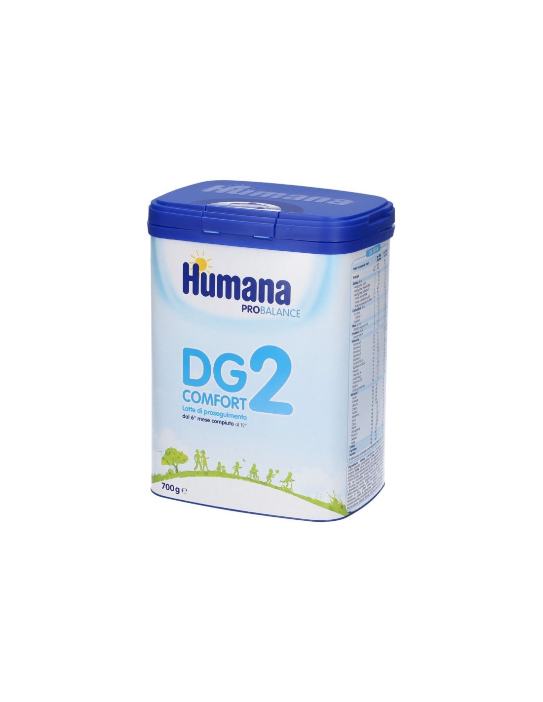 Per la formula di Humana DG COMFORT 2 è stato utilizzato sieroproteine del latte vaccino e una miscela lipidica con un olio vegetale strutturato ad alto contenuto di beta-palmitato. Contiene inoltre GOS, galatto-oligosaccaridi, fibre, DHA, un acido grasso essenziale omega-3, e vitamina A, C, e D che contribuiscono al normale funzionamento del sistema immunitario.