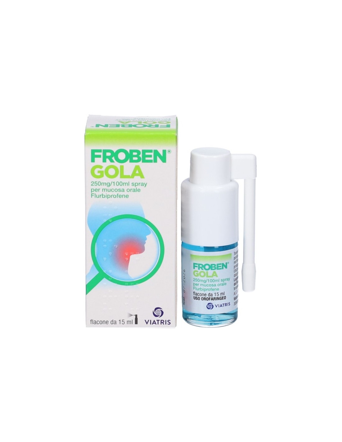 La somministrazione di un FANS può causare una riduzione dose dipendente della formazione di prostaglandine, accelerando l’insufficienza renale. I pazienti a più alto rischio di sviluppare questa reazione sono quelli con funzionalità renale compromessa, insufficienza cardiaca e disfunzione epatica, coloro che assumono diuretici e le persone anziane. In questi pazienti la funzionalità renale deve essere monitorata (vedere anche il paragrafo 4.3). Effetti cardiovascolari e cerebrovascolari Un adeguato monitoraggio ed opportune istruzioni sono necessarie nei pazienti con anamnesi positiva per ipertensione e/o insufficienza cardiaca congestizia da lieve a moderata poiché, in associazione al trattamento con i FANS, sono stati riscontrati ritenzione di liquidi ed edema. In questi pazienti Froben Gola deve essere assunto con cautela. Studi clinici e dati epidemiologici suggeriscono che l’uso di alcuni FANS specialmente ad alti dosaggi e per trattamenti di lunga durata, può essere associato ad un modesto aumento del rischio di eventi trombotici arteriosi come ad esempio infarto del miocardio o ictus. Non ci sono dati sufficienti per escludere un rischio simile per flurbiprofene. I pazienti con ipertensione non controllata, insufficienza cardiaca congestizia, cardiopatia ischemica accertata, malattia arteriosa periferica e/o malattia cerebrovascolare devono essere trattati con flurbiprofene soltanto dopo attenta valutazione. Analoghe considerazioni devono essere effettuate prima di iniziare un trattamento di lunga durata in pazienti con fattori di rischio per malattia cardiovascolare (p.es. ipertensione, iperlipidemia, diabete mellito, fumo). Reazioni cutanee Gravi reazioni cutanee, alcune delle quali fatali, includenti dermatite esfoliativa, sindrome di Stevens–Johnson e necrolisi tossica epidermica, sono state riportate molto raramente in associazione con l’uso dei FANS. Nelle prime fasi della terapia i pazienti sembrano essere a più alto rischio: l’insorgenza della reazione si verifica nella maggior parte dei casi entro il primo mese di trattamento. Flurbiprofene deve essere interrotto alla prima comparsa di rash cutaneo, lesioni della mucosa o qualsiasi altro segno di ipersensibilità. Effetti Renali Cautela deve essere usata quando si inizia il trattamento con FANS come ad esempio il flurbiprofene in pazienti con disidratazione considerevole. Effetti ematologici Flurbiprofene, come altri FANS, può inibire l’aggregazione piastrinica e prolungare il tempo di sanguinamento. Lupus Eritematoso Sistemico (SLE) e malattie del sistema connettivo In pazienti affetti da Lupus Eritematoso Sistemico (SLE) e disturbi del sistema connettivo si può verificare un aumento del rischio di meningite asettica (vedere paragrafo 4.8). Gli effetti sopra riportati sono stati segnalati in particolare dopo la somministrazione di formulazioni a base di Flurbiprofene ad uso sistemico. Alle dosi consigliate, l’eventuale deglutizione di FROBEN GOLA non comporta alcun danno per il paziente in quanto tali dosi sono ampiamente inferiori a quelle della posologia singola del prodotto per via sistemica. L’uso di FROBEN GOLA, specie se prolungato, può dare origine a fenomeni di sensibilizzazione o di irritazione locale; in tali casi occorre interrompere il trattamento e consultare il medico per istituire, se necessario, una terapia idonea. Non usare per trattamenti protratti. Dopo brevi periodi di trattamento senza risultati apprezzabili consultare il medico. Informazioni importanti su alcuni eccipienti Sia il collutorio che lo spray contengono alcool etilico. Per chi svolge attività sportiva, l’uso di medicinali contenenti alcool etilico può determinare positività ai test antidoping in rapporto ai limiti di concentrazione alcolemica indicata da alcune federazioni sportive.