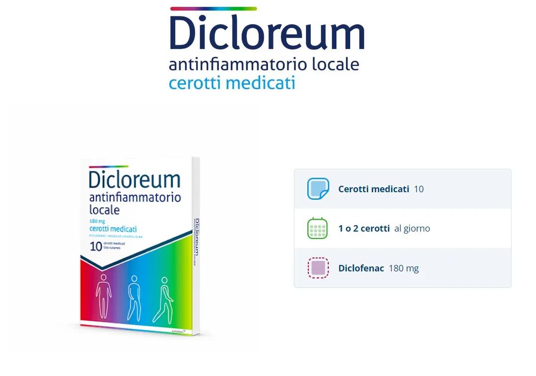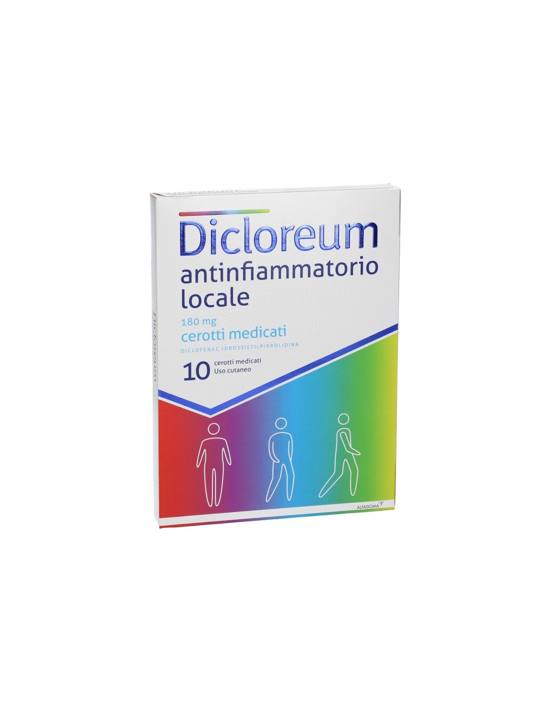 Dicloreum antinfiammatorio locale cerotti medicati (180 mg) è un farmaco antinfiammatorio e antidolorifico per uso cutaneo a base di diclofenac idrossietilpirrolidina.
