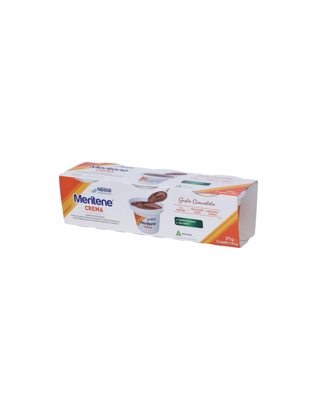 Crema dessert al gusto cioccolato, addizionata con vitamine e minerali, ad alto contenuto di proteine, per persone malnutrite o con problemi di deglutizione.