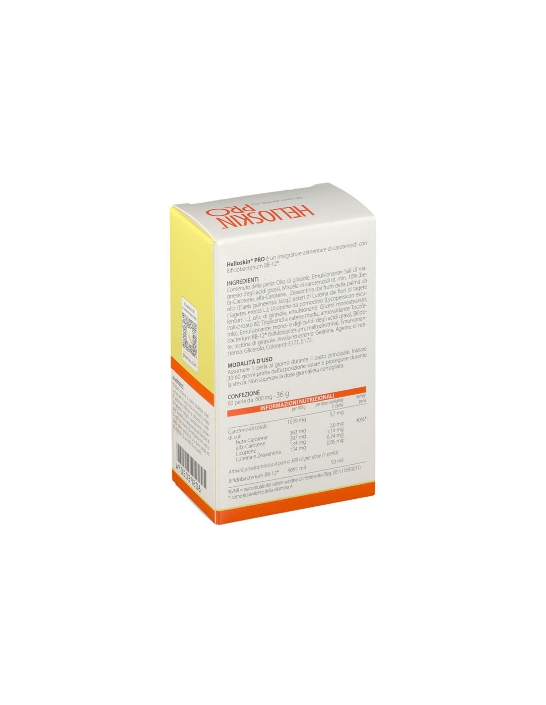 Integratore alimentare di carotenoidi con Lactobacillo BB-12®. Il beta-Carotene è il precursore della Vitamina A, la quale contribuisce al mantenimento di una pelle normale ed alla normale funzione del sistema immunitario. Utile per aumentare le difese naturali della pelle durante l'esposizione solare, favorendo tempi di esposizione prolungati nei fototipi più a rischio e maggiore intensità dell'abbronzatura in pelli normali. In base alle dichiarazioni allergeni degli ingredienti, Helioskin Pro non contiene nessuno degli allergeni secondo la normativa vigente (Allegato III bis Direttiva 2007/68/CE).